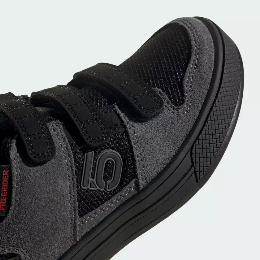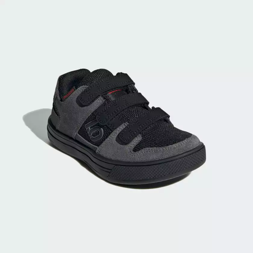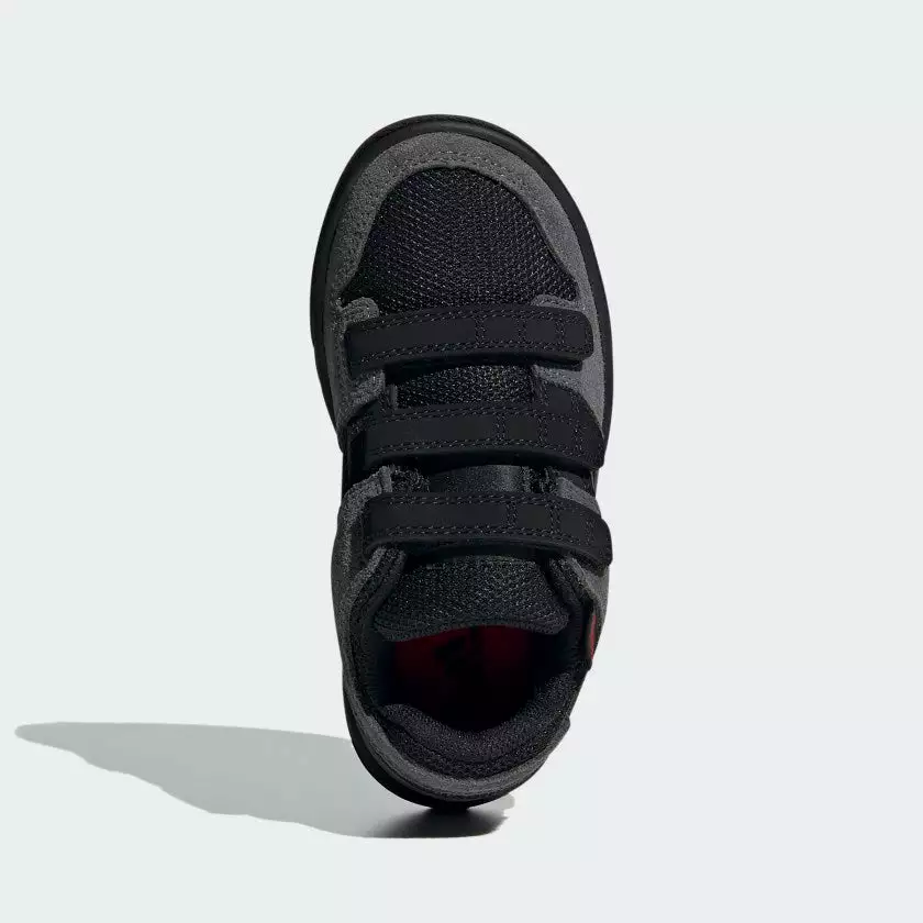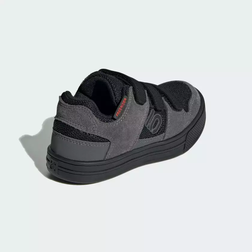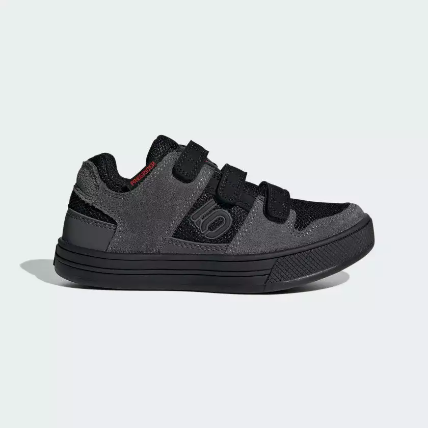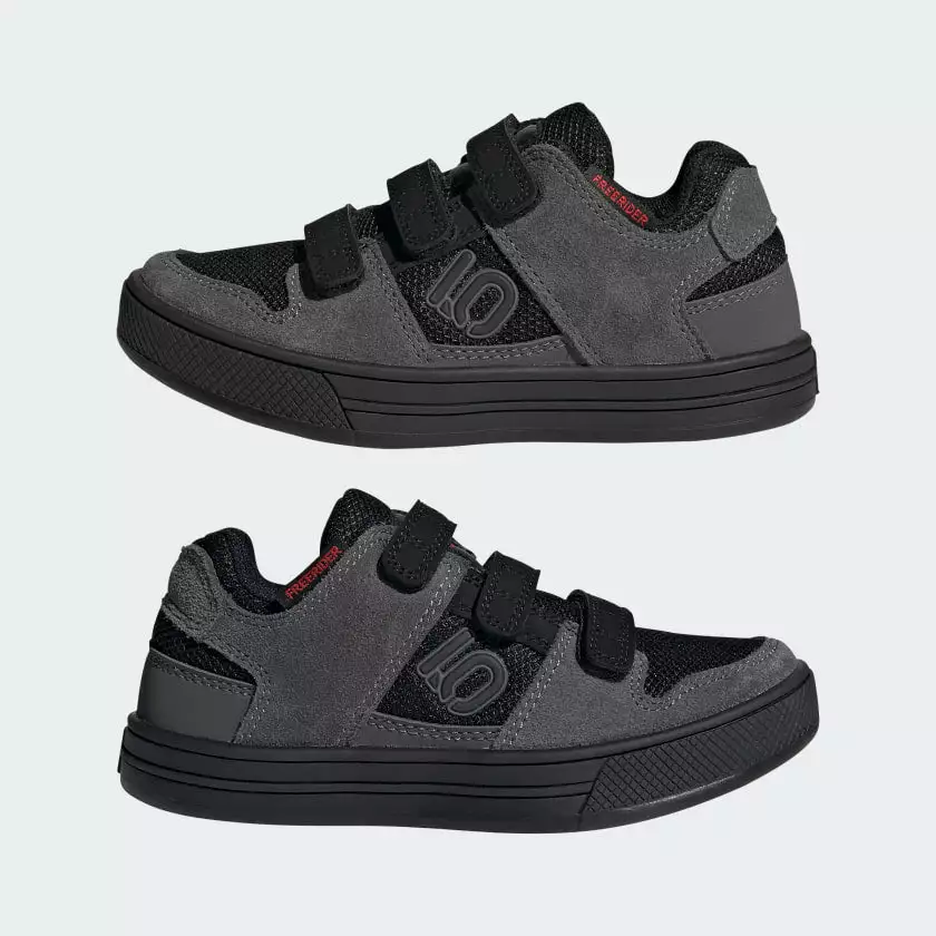 The adidas Five Ten Freerider Kids Flat Pedal Shoes-Grey Five/Core Black/Grey Four offer the perfect combination of grip and durability for young mountain bike riders. With the convenience of hook-and-loop straps and a Stealth® Marathon rubber outsole, they ensure a safe and confident ride on challenging terrain. The slick black and grey colorway is sure to draw admirers, too.