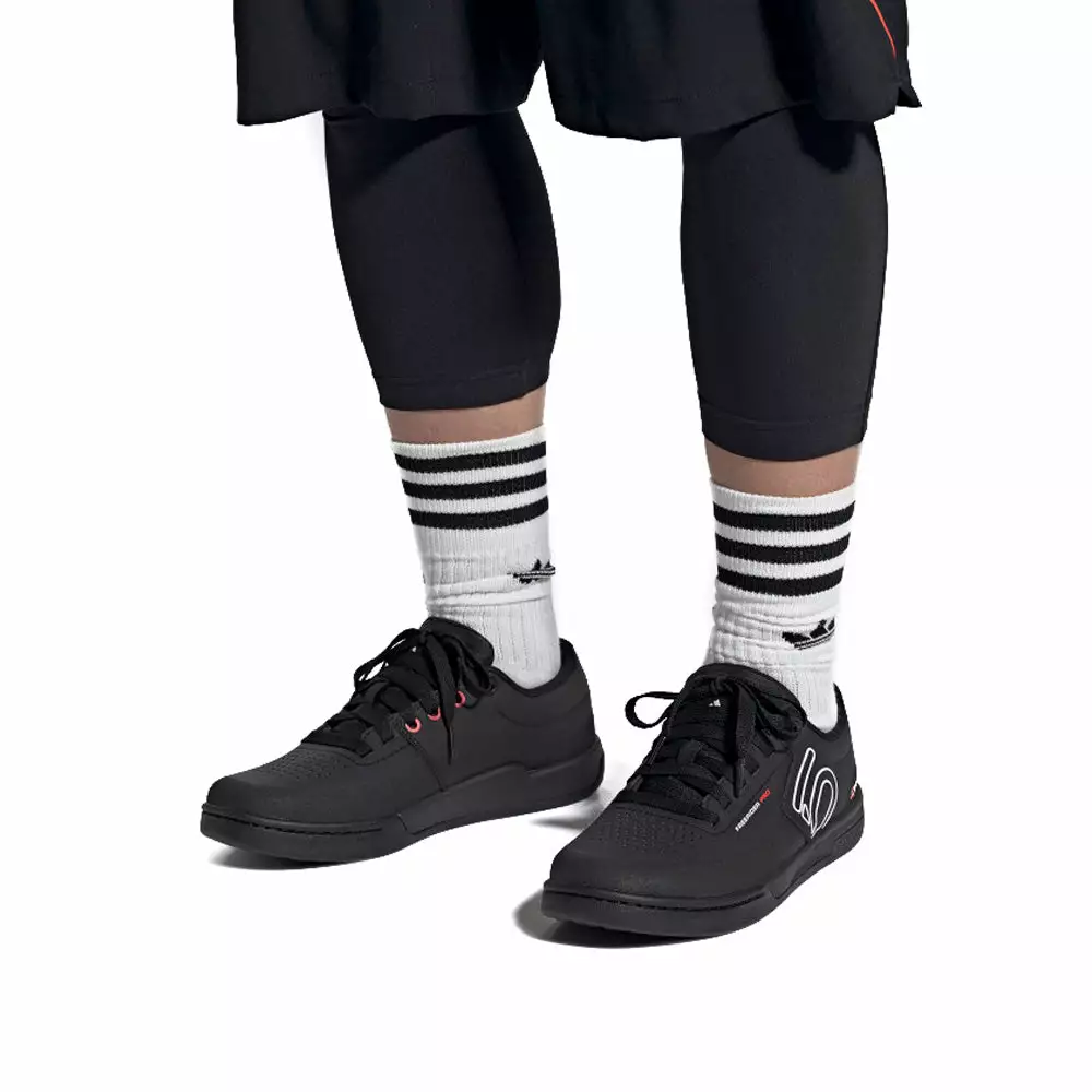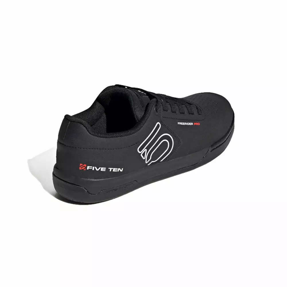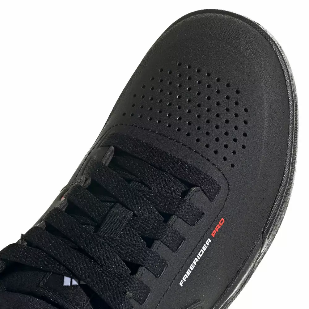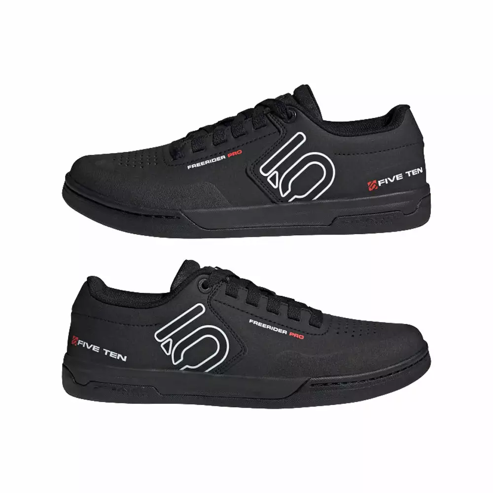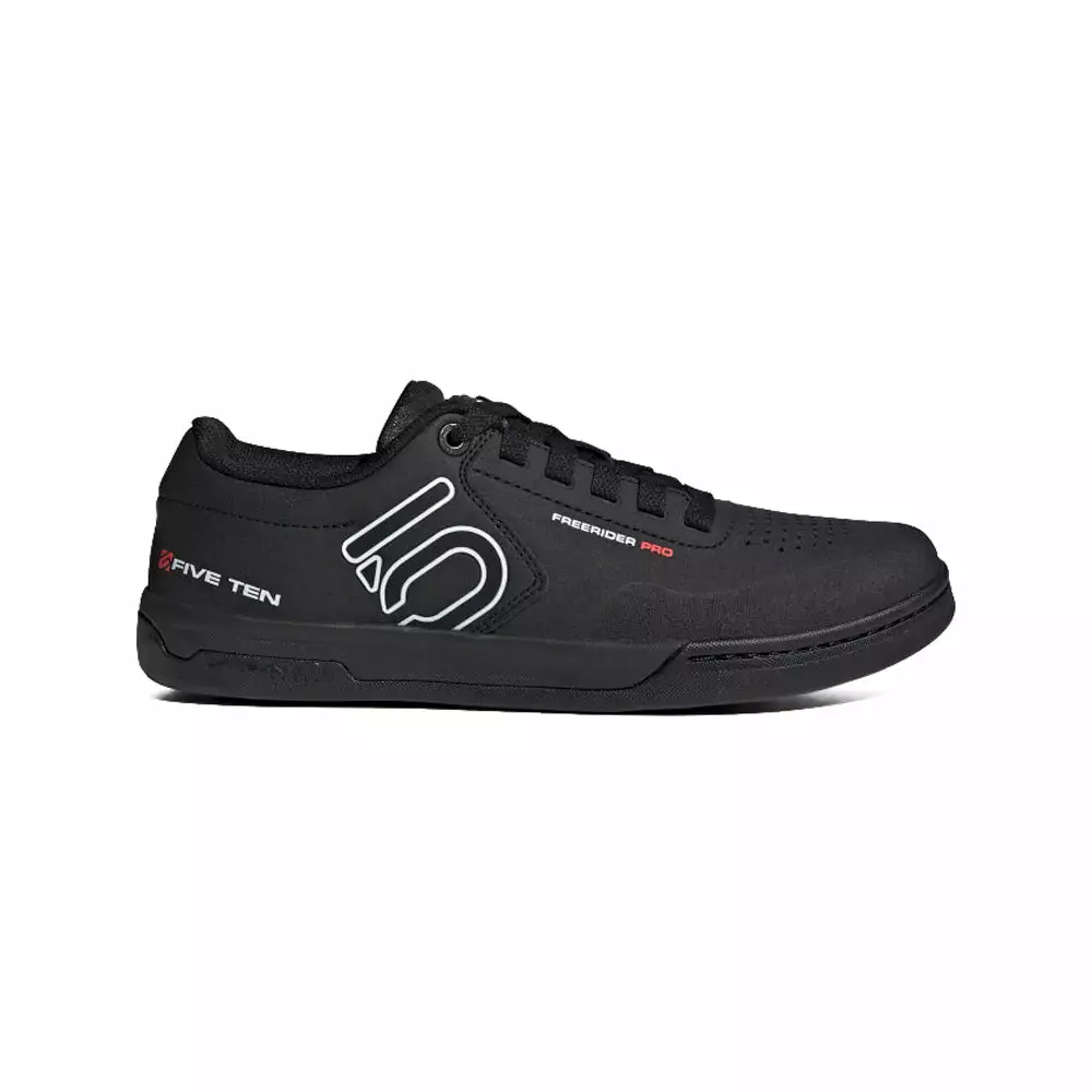 The Adidas Five Ten Freerider Pro Flat Pedal Shoes-Core Black/FTWR White/FTWR White couples a reinforced toebox to a quick to dry, water resistant, synthetic upper. The Stealth S1 Dotty rubber compound in the sole provides the grip you need to stay firmly planted on your pedals.