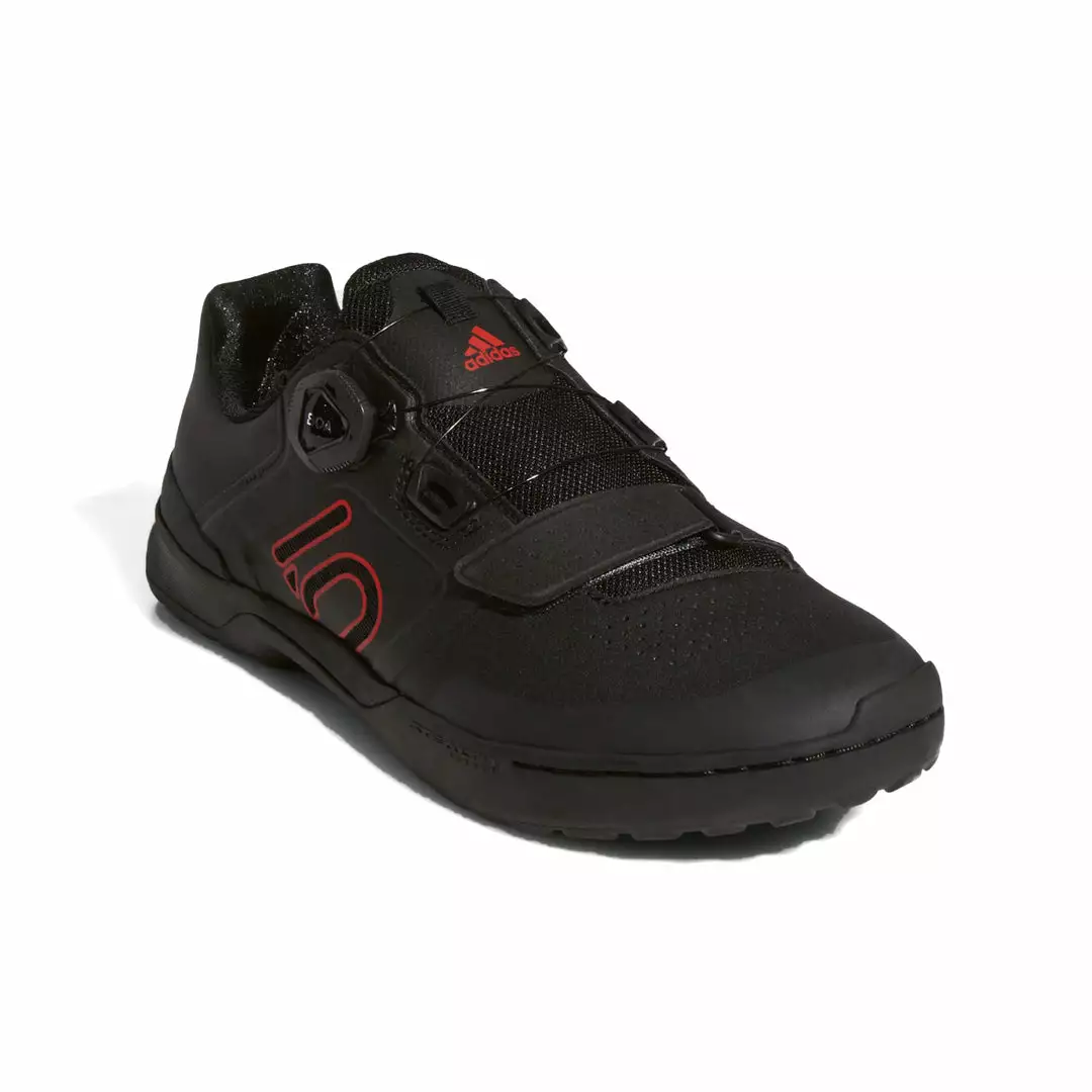 The adidas Five Ten Kestrel Pro Boa Clipless Shoes-Core Black/Red/Grey Six feature Stealth® C4 rubber soles, giving you the perfect mix of durability and stickiness for excellent pedal grip and performance. The Boa® Fit System gives you the ability to make the micro adjustments needed to dial in a secure, comfortable hold around your feet. A weather resistant upper, combined with breathable mesh inserts, wick away the elements, helping to keep your feet comfortable while performing. And adidas has committed to more sustainable options by utilizing recycled material. 20% of the pieces in the upper are made with a minimum of 50% recycled content.