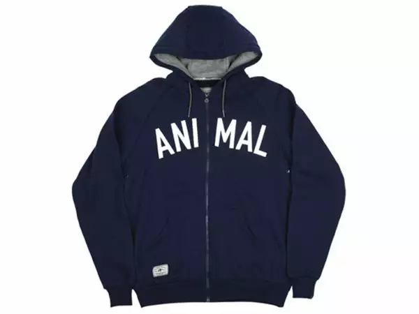 Soft cotton fleece hooded zip up sweatshirt with raglan sleeves and front pocket. Features a heavy felt Animal appliqu across the chest, woven label on the pocket, and a lined contrasting hood