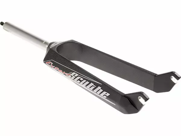 Molded hi-density carbon legs – Forged aluminum dropouts – Completely integrated crown with molded legs – 1-inch 7075 aluminum steer tube – Integrated stem locking mechanism