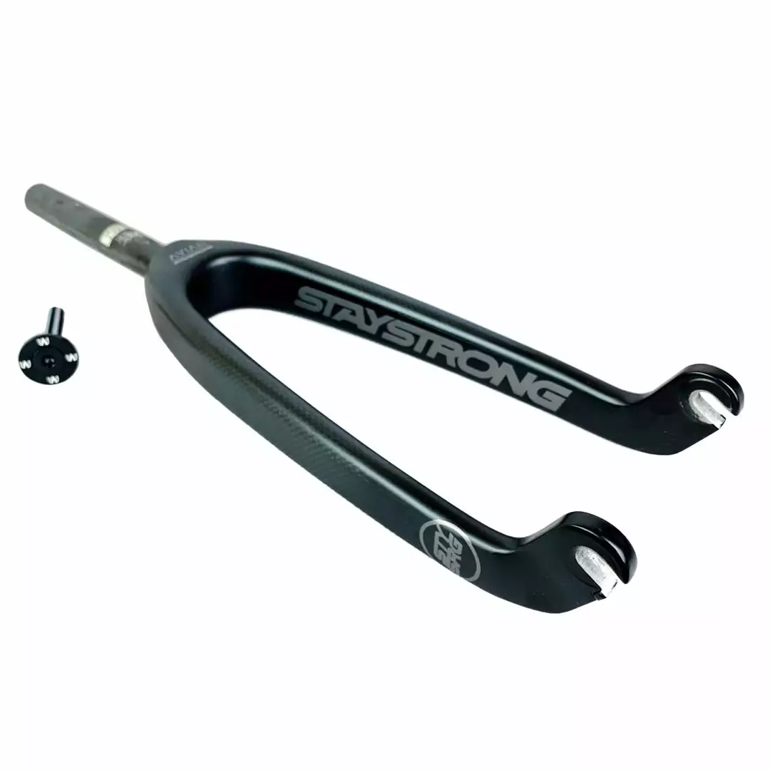 A powerful combination, the Avian x Stay Strong Versus Youth Carbon Fork brings the best of Avian and Stay Strong together in a professional offering for carbon forks. The steerer tube is made of 4mm thick aluminum and features an internal locking mechanism that eliminates star nuts and expander plugs, thus increasing the durability of these forks even more so over other brands. 20mm alloy dropouts sit within Toray fiber forks.