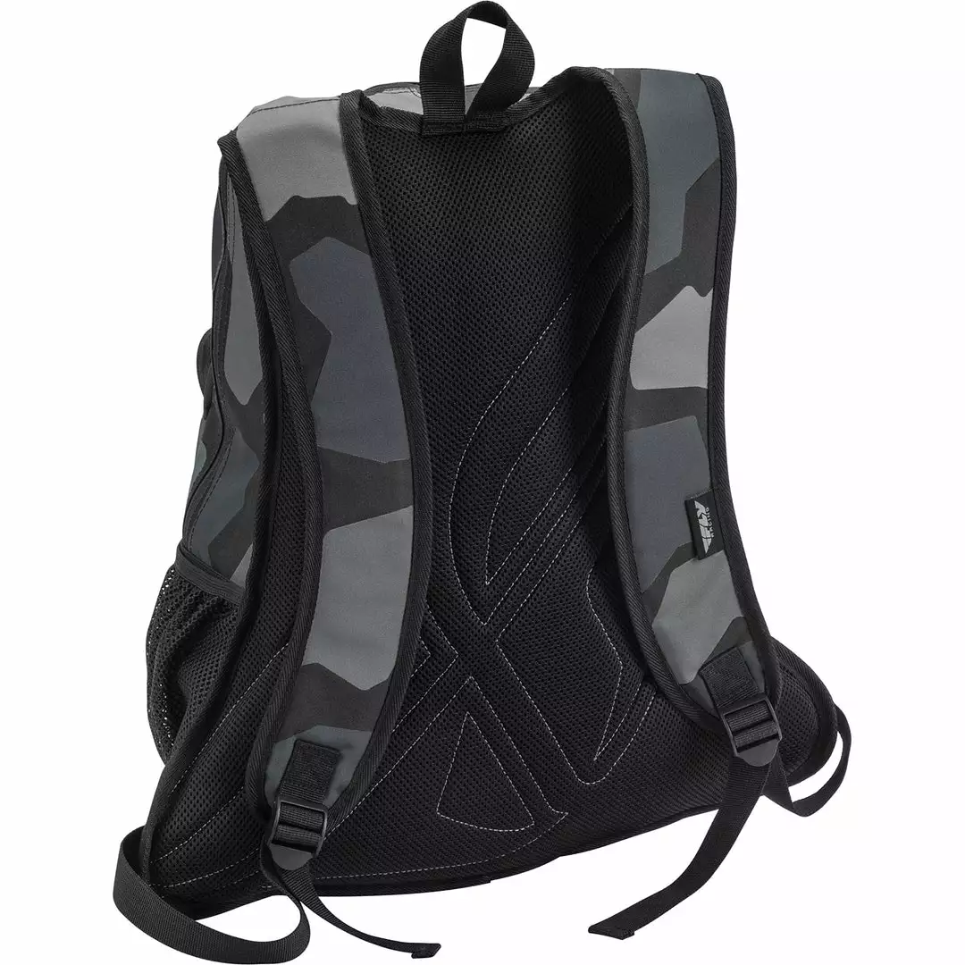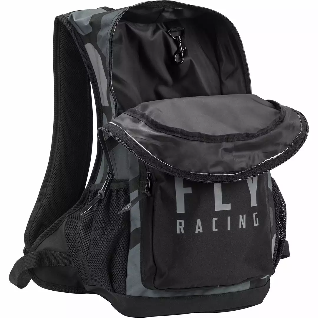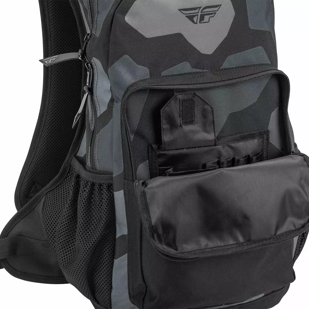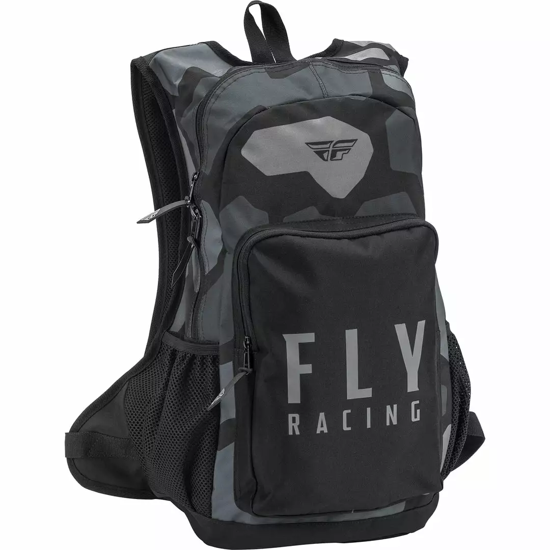 The Fly Racing Jump Pack Backpack-Grey/Black Camo features two zippered compartments (utilizing YKK® zippers) separated by a durable, hard plastic divider, and elasticized water bottle pockets on each side. The bold, colorful printed graphics will complement the rest of your gear as you store and transport your equipment with confidence.