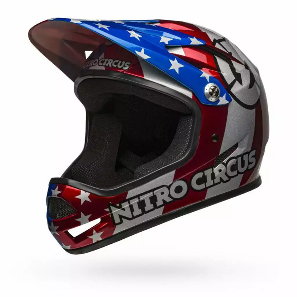 The Bell Sanction Helmet-Nitro Circus-Gloss Silver/Blue/Red is the perfect choice for anyone looking for a full-face helmet with a slimmer profile. Weighing in at just 850 grams, this helmet provides full-face protection while sporting a smaller size than the Full-9 or Transfer-9. This helmet is a great fit for those needing less robust options.
