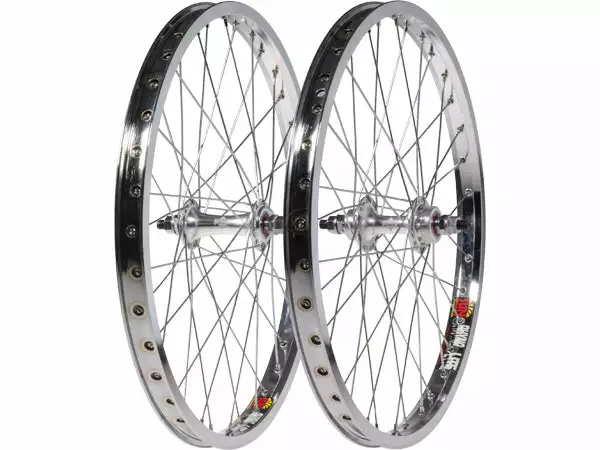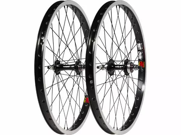 Black Ops flip-flop BMX hubs on SUN Rhyno Lite 20×1.75″ rims featuring durable spokes and brass nipples