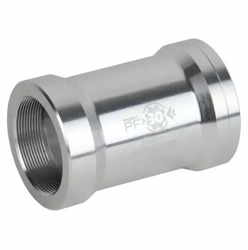 Presses into a PF30 bottom bracket shell with 46mm inner diameter (ID) and 68mm width to allow a threaded bottom bracket to be installed.