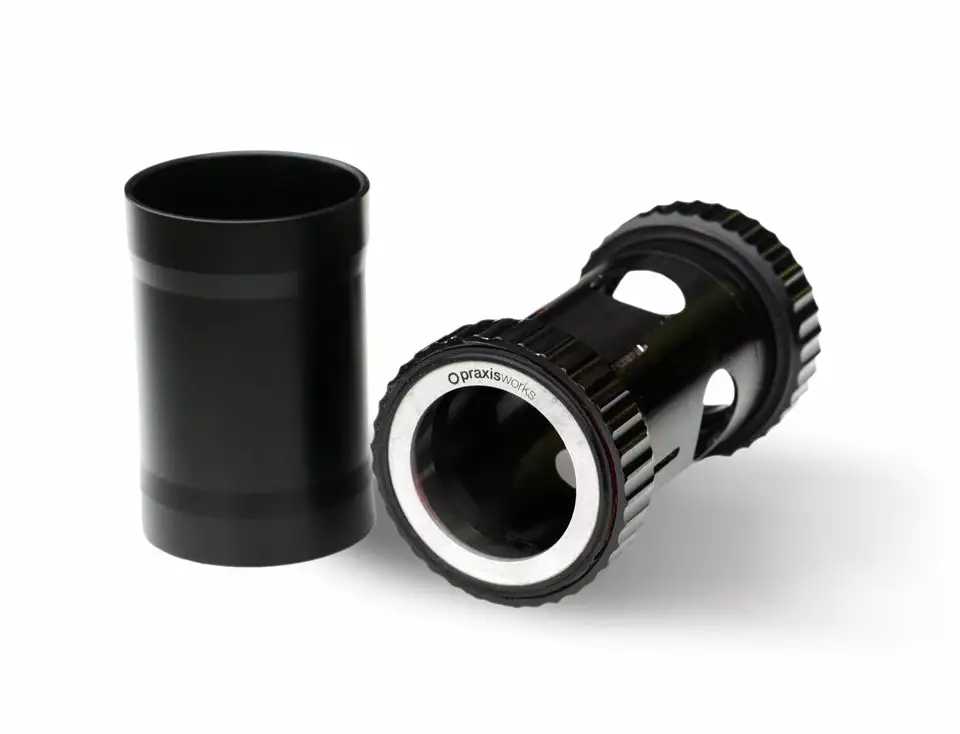 Simply press in the longer non-drive-cup, then the shorter drive cup threads into it. As the drive cup threads in, Praxis’ trademark Collet system expands to a precise limit, evenly dispersing pressure for a super tight fit. With both cups connected and the collet set exactly to spec, there is no chance the bearings can come out of alignment or wiggle/walk out of the frame. This design also uses a compressible o-ring on the non-drive side cup to compensate for frame shell width discrepancies.