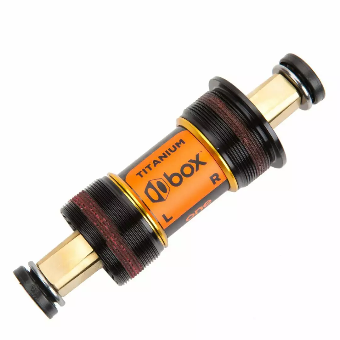 The Box One Square Taper Titanium Bottom Bracket – Gold is the gold standard among bottom brackets. Features a square taper, hollow titanium-nitride-coated titanium spindle. Yes, that sounds like a lot, and it is, but it certainly doesn’t weigh a lot. Between 185 and 190 grams. The titanium spindle makes this component super stiff to keep in line with Box’s philosophy of stiffening the whole drivetrain (and handlebars) in a bid to get the very most out of each and every pedal rotation. Other features include carbon fiber center seals, abec-5 bearings, and alloy cups.