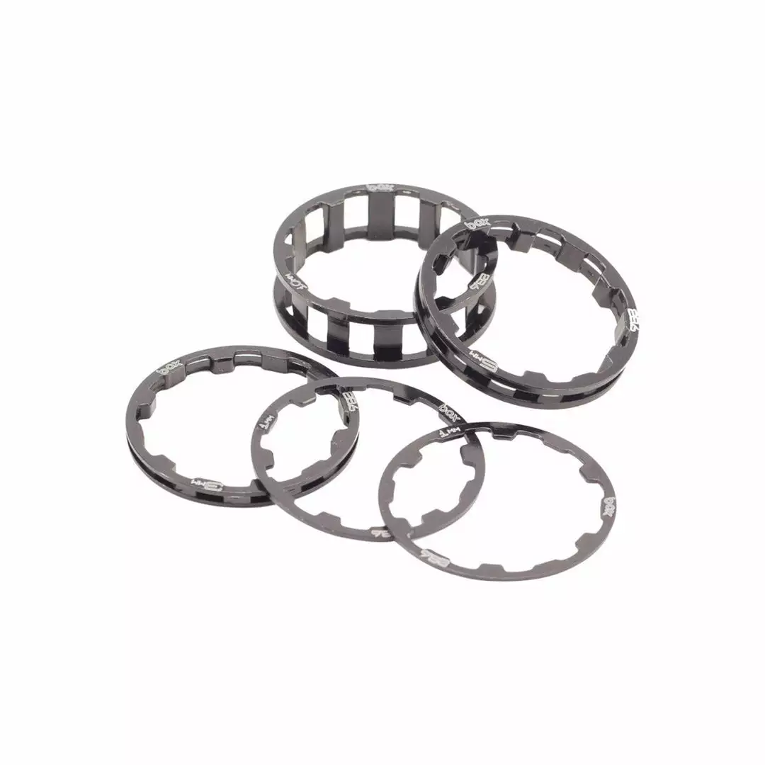 The Box One Stem Spacer Kit contains five different sized spacers all made from extruded CNC-machined 6061-T6 aluminum. Mixing and matching the spacers will allow you to make adjustments between 1 and 20mm. Ideally, they should be stacked so the vertical supports are all in alignment.