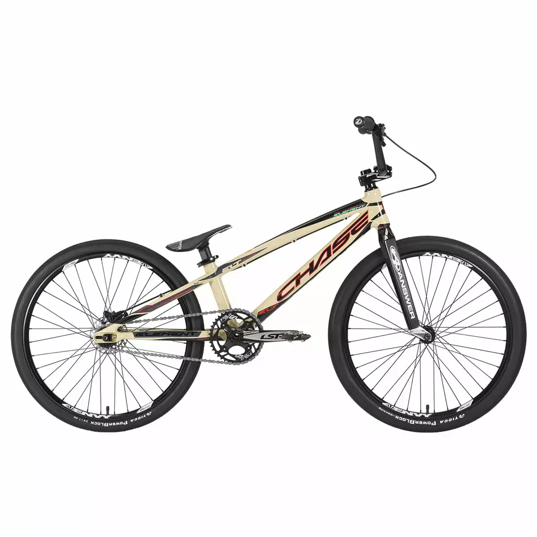 Building a custom Pro level race bike can be a difficult task while trying to stay within a budget. With the Chase 2021 Element Cruiser 24″ BMX Race Bike-Sand, we did all the hard work for you. We wanted to offer a bike that our Chase Factory Pro riders could race right out of the box, while taking into consideration that the cost needs to be realistic for everyday racers who still want the best bike. With the new 2021 Chase Element, we have done just that, offering you the best bike for the price! The 2021 Element utilizes the same geometry as our Championship winning ACT and RSP race frames. The Element frame features Hydroformed and butted tubing, a new integrated chain tensioner / disc brake mounting system, a Press Fit Bottom Bracket, and a 31.8 Handle Bar/Stem combo.