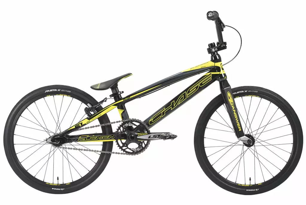 While function is more important that fashion, the first thing you will notice about the 2019 Chase Element bike is the new Flow Graphics on the Brilliant Black Element frame that features our exclusive Aero Pivotal seat post and Aero clamping system, Hydroformed Premium Speedlite Alloy, with the Chase BIO-FIT geometry. Custom Graphics also grace the Answer Dagger Carbon Fork and the Sun Ringlé Envy rims. The Matching Elevn PC seat, the Excess LSP Cranks, and The Chase Bars with Flow Graphics makes the bike look as factory as Joris and Connor too! Next we made the bike literally faster, by adding the Tioga FASTR X tires to the Element complete. We didn’t stop there on the wheels either, as we upgraded the Rear hub with our new Triple Precise Clutch System, that has less drag while offering fast engagements and 72 points of Engagement. Other standout features include a Shimano Brakes, Insight C.O.G.S. grips, 4 Bolt Chainring Chain tensioners, and a KMC Chain.