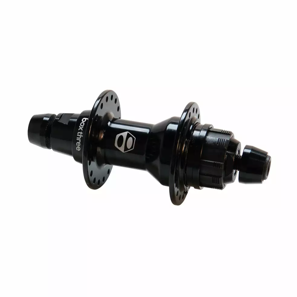 Box Three Pro Rear Hub-10mm-36H-Black is the budget friendly solution for riders looking to upgrade their rear hub. With an aluminum shell, and 4-pawl, 120-points of engagement, and 10mm steel axle it falls right into the middle of the strength-weight-cost Venn diagram. Includes Steel Bolts, Lockring, Spacers, and 16T Cog.