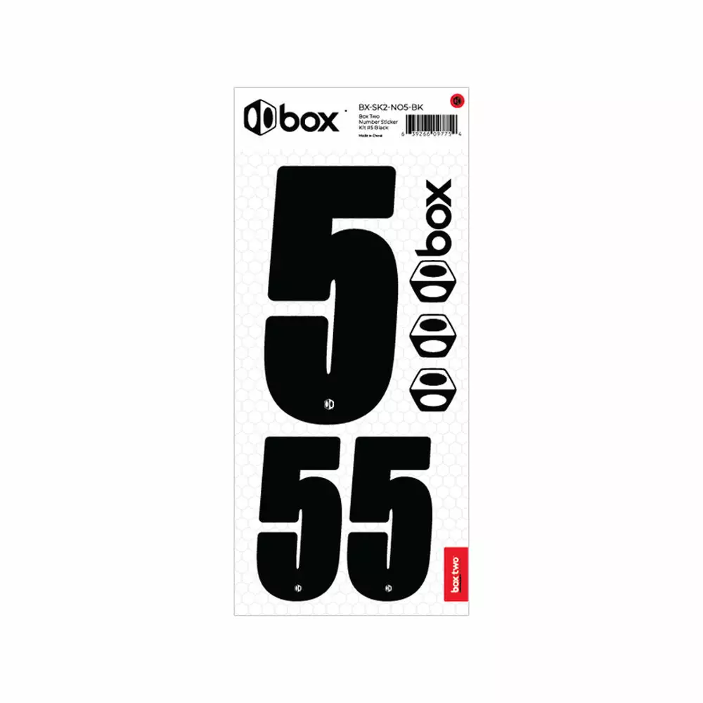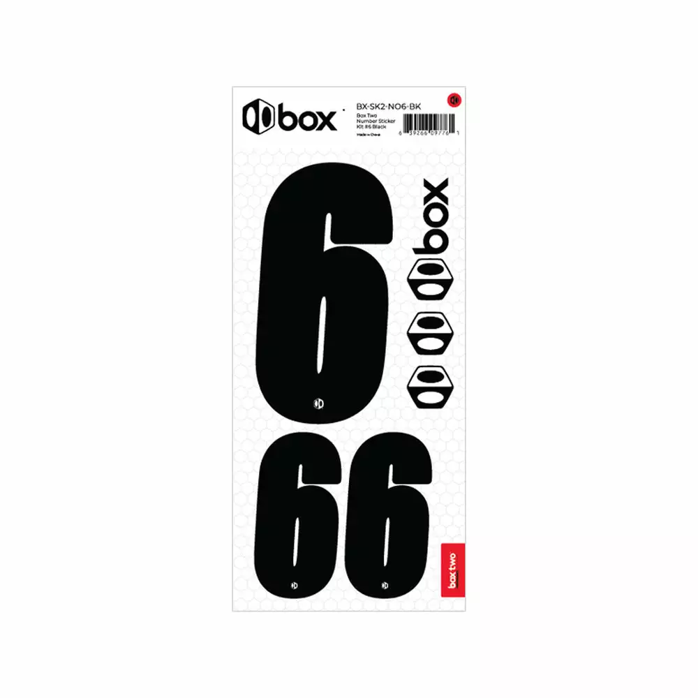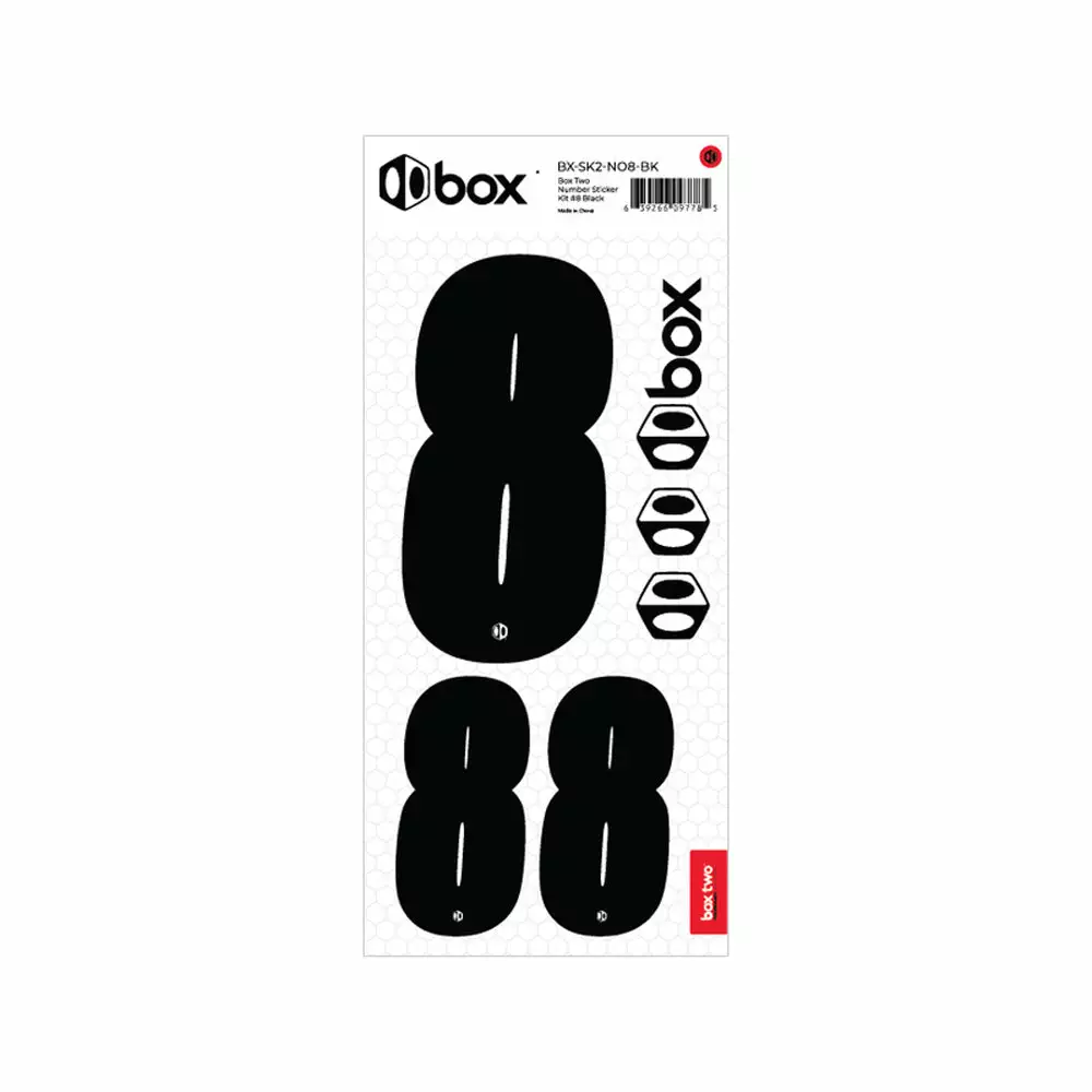 The Box Two Number Sticker Kit are manufactured to conform to USABMX/UCI front number sizing requirements. Made from UV resistant vinyl, each package contains one large front number and two smaller side plate numbers.