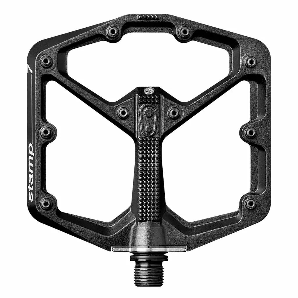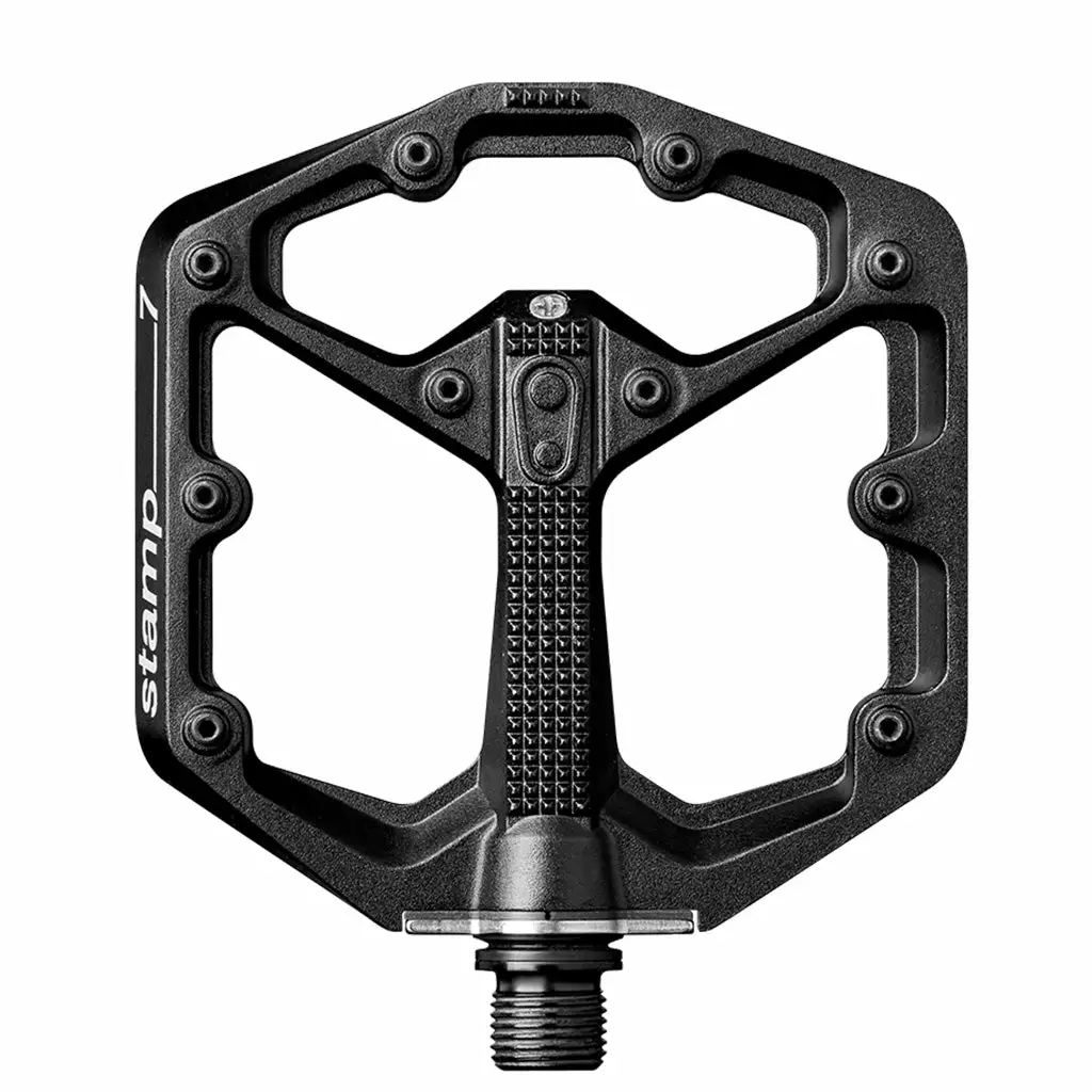 The Crank Brothers Stamp 7 Platform Pedals are close to the pinnacle of Crank Brothers pedal lineup. The big feature here is the forged scm 435 chromo spindle fitted to the aluminum alloy body. There are ten adjustable pins on each side of the concave and really thin platform. Igus LL-glide inner and outer bearings…even a grease port for easy breezy maintenance.