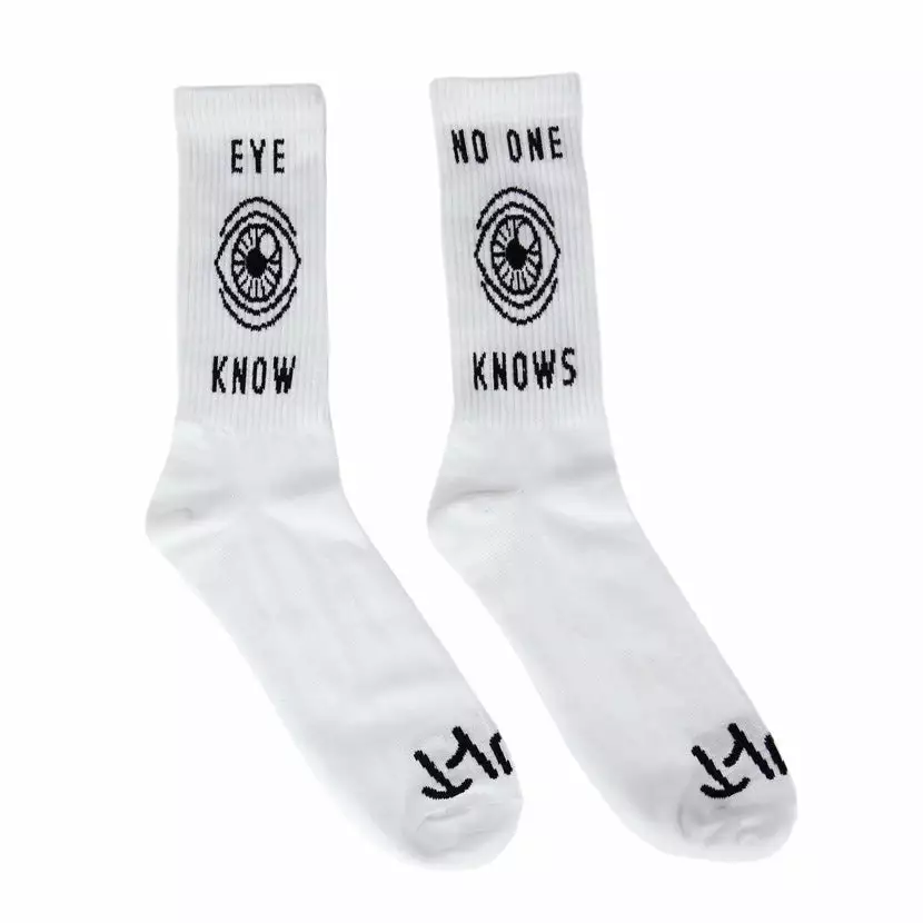 “EYE KNOW” on one sock… “NO ONE KNOWS” on the other sock…