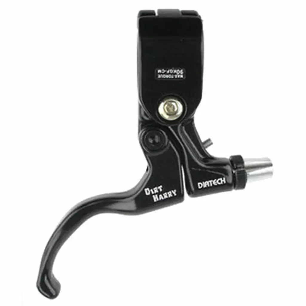 The Diatech Dirt Harry Brake Lever-Rear-Black-Black at J&R Bicycles includes a hinged bracket and lever both crafted from high strength forged aluminum. The lever itself features a curved bend for under bar mounting and improved knuckle clearance. This two-finger rear lever has a clamp diameter of 22.2mm.