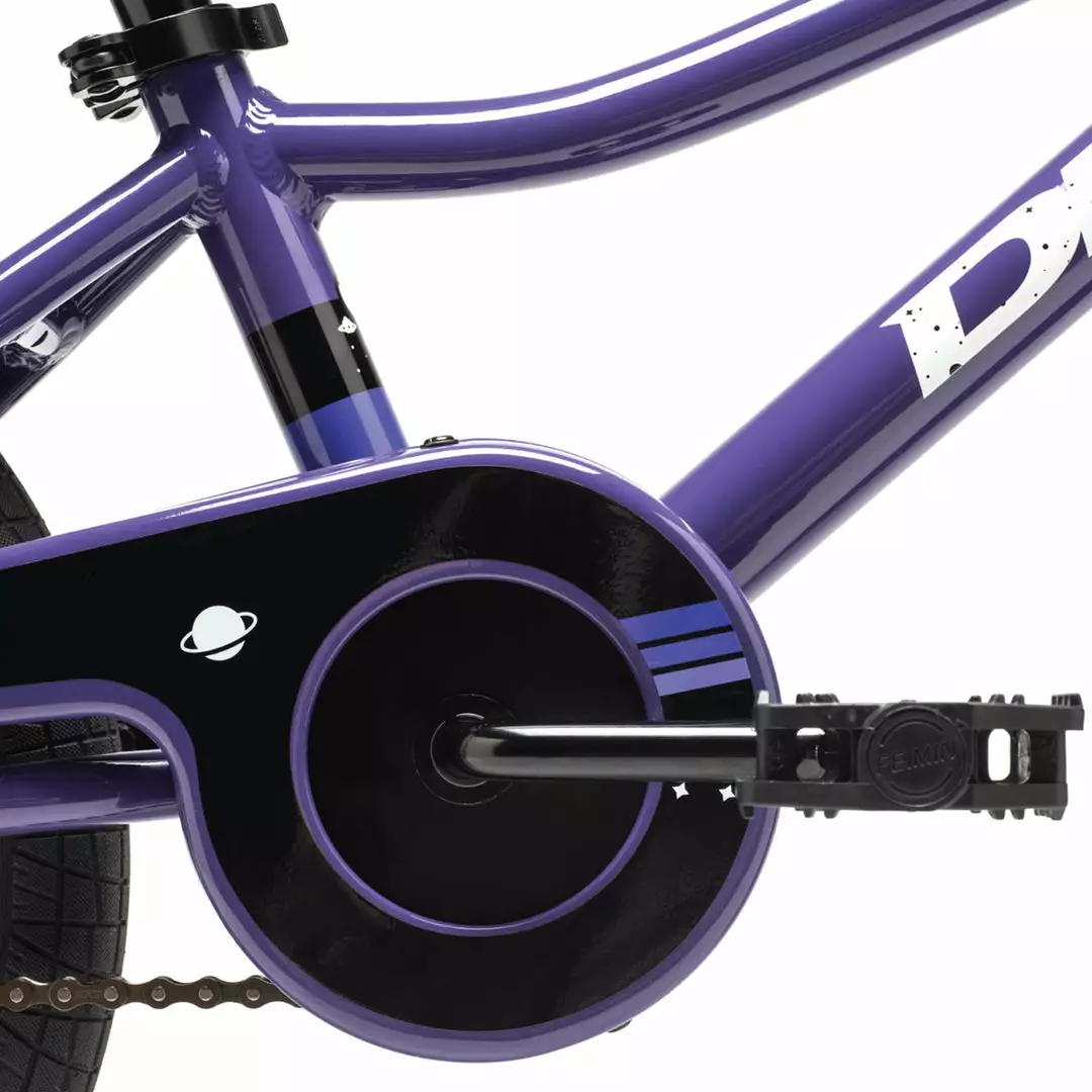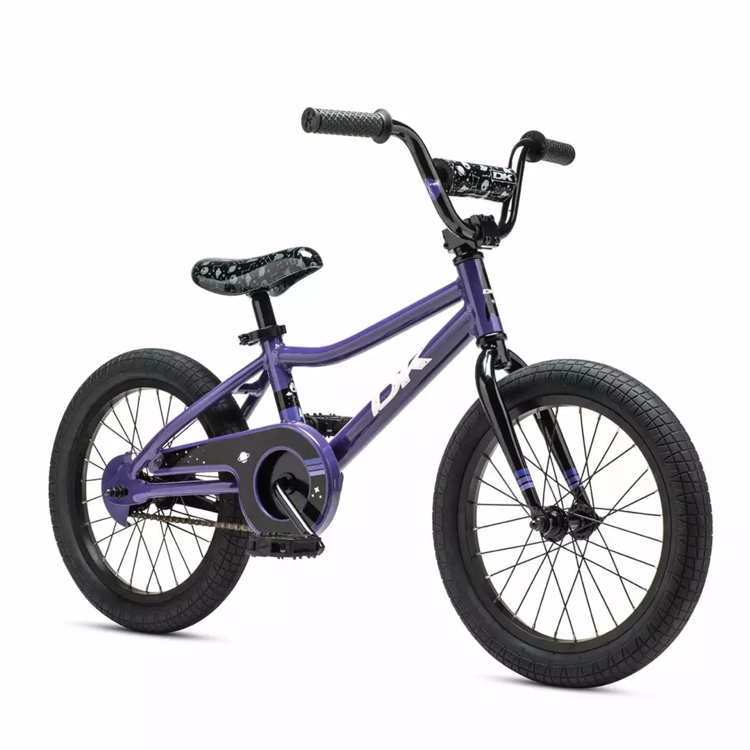 The bigger of the two new Devo kid’s bikes, the DK Devo 16″ Kids Bike-Purple rolls steady on 16” wheels. With the included training wheels in place, the Devo 16 helps young riders figure the whole “balancing while pedaling” fundamentals of riding a bicycle. With a lightweight and sturdy aluminum frame and rims, the Devo is easy for little people to handle on the bike path and easy for parents to load into the car or hang up in the garage. The quick release seat clamp makes adjusting the seat height easy and tool-free. A coaster brake and full-coverage chainguard are “safety-first” features that make the Devo easy to ride and give you peace of mind. When the big day comes, take the training wheels off and set them free — the DK Devo 16 is the bike your kid will always remember.
