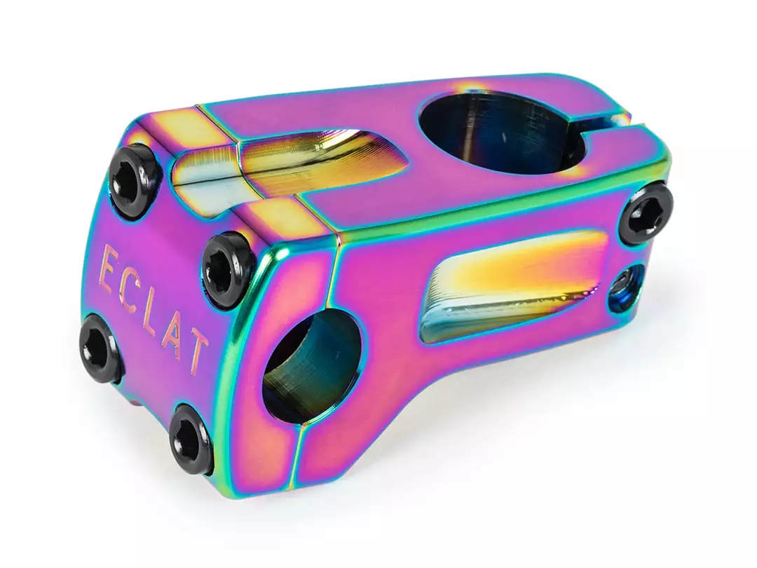 The Eclat Domain Front load Stem is manufactured using high quality CNC machined 6061-T6 aluminum and offers the classic front load design with nicely rounded edges. Cutouts were added to shave off as much weight as possible. The incorporation of massive allen bolts hold sturdy clamping properties and solid stability. The Eclat Domain Front load Stem offers a 50mm offset and a wide bar clamping area providing a snug sturdy fit for high and wide handlebars.