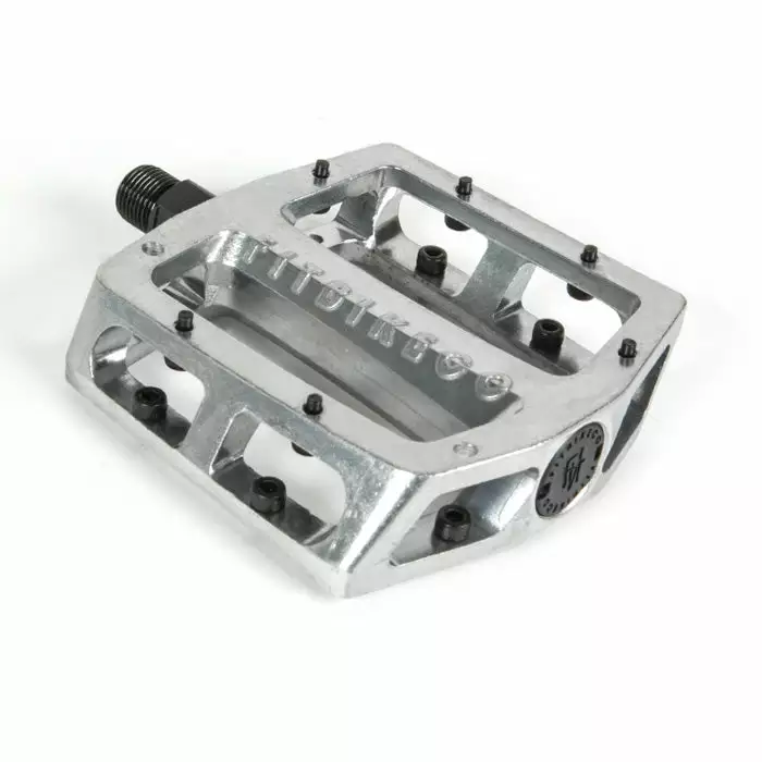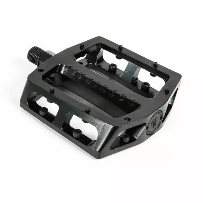 The Fit Mac-Alloy Pedals feature an oversized CrMo spindle for strength and accepts a 17mm or 15mm wrench as well as a 6mm Allen wrench. The ergonomic shape is designed to grip your foot better than traditional pedal shapes while getting pins out of the way for grinds. No pedal slipping on these bad boys. A strong, long-lasting, alloy pedal is just as good on street as it is at the trails. Platform pedals offer an all-around elite performance for all riding styles.