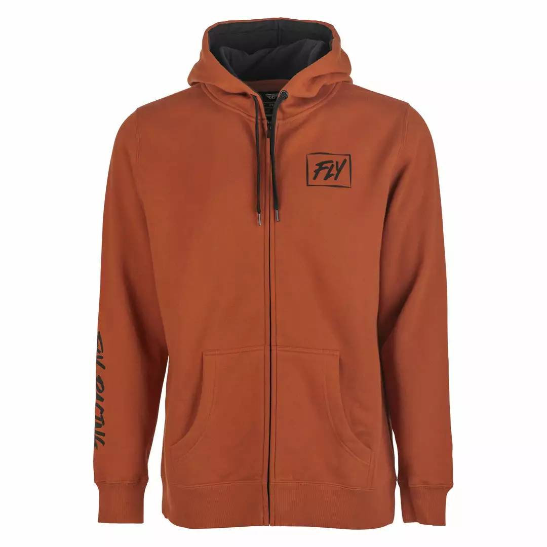Fly Racing Lite Hoodie-Rust is a mid-weight, poly-cotton blend zip up. Features a low-key screen print logo on the front and one on the right sleeve for that laid-back asymmetrical look.