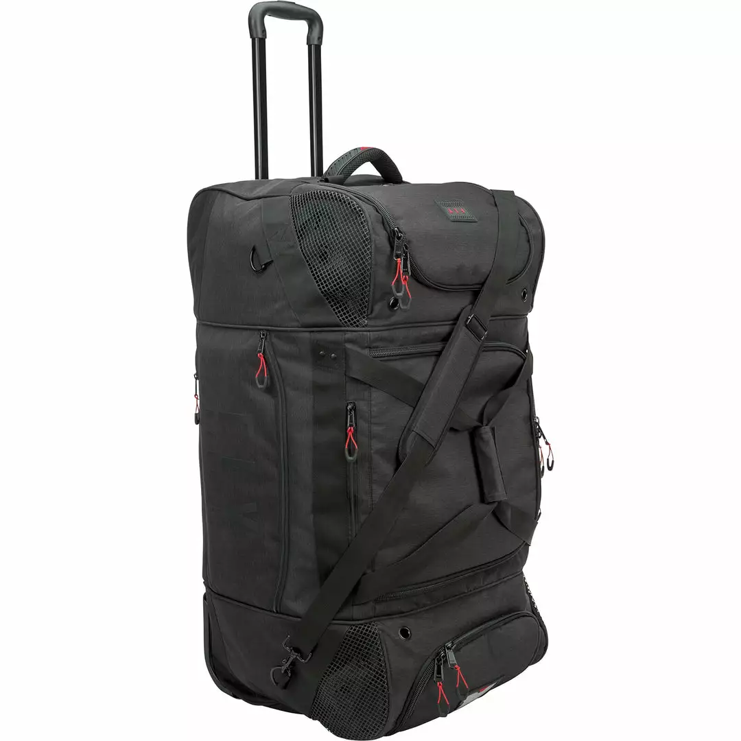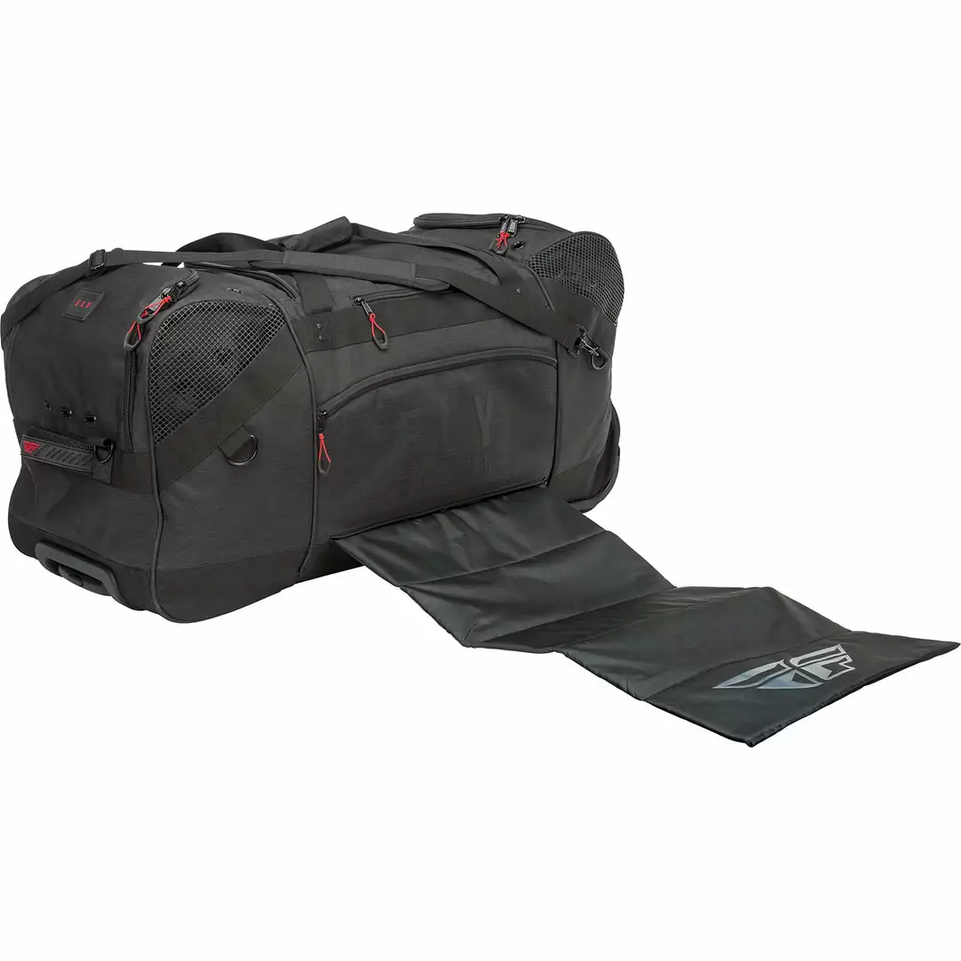 Mobility and protection is a breeze with the Fly Racing Roller Grande Bag-Black’s smooth rollerblade style wheels and rugged telescoping handle. Two large separate pockets on each side can easy store items as large as a pair of riding boots, with the center main compartment able to store even larger items. With the mesh panels and vent grommets for air drying, the mud mat is easily accessible from the side of the bag for easy removal and cleaning, helping you manage your dirty gear between rides. Also included are plenty of tool storage pockets, this Fly Racing Roller Grande Bag-Black can be your shop away from the shop.
