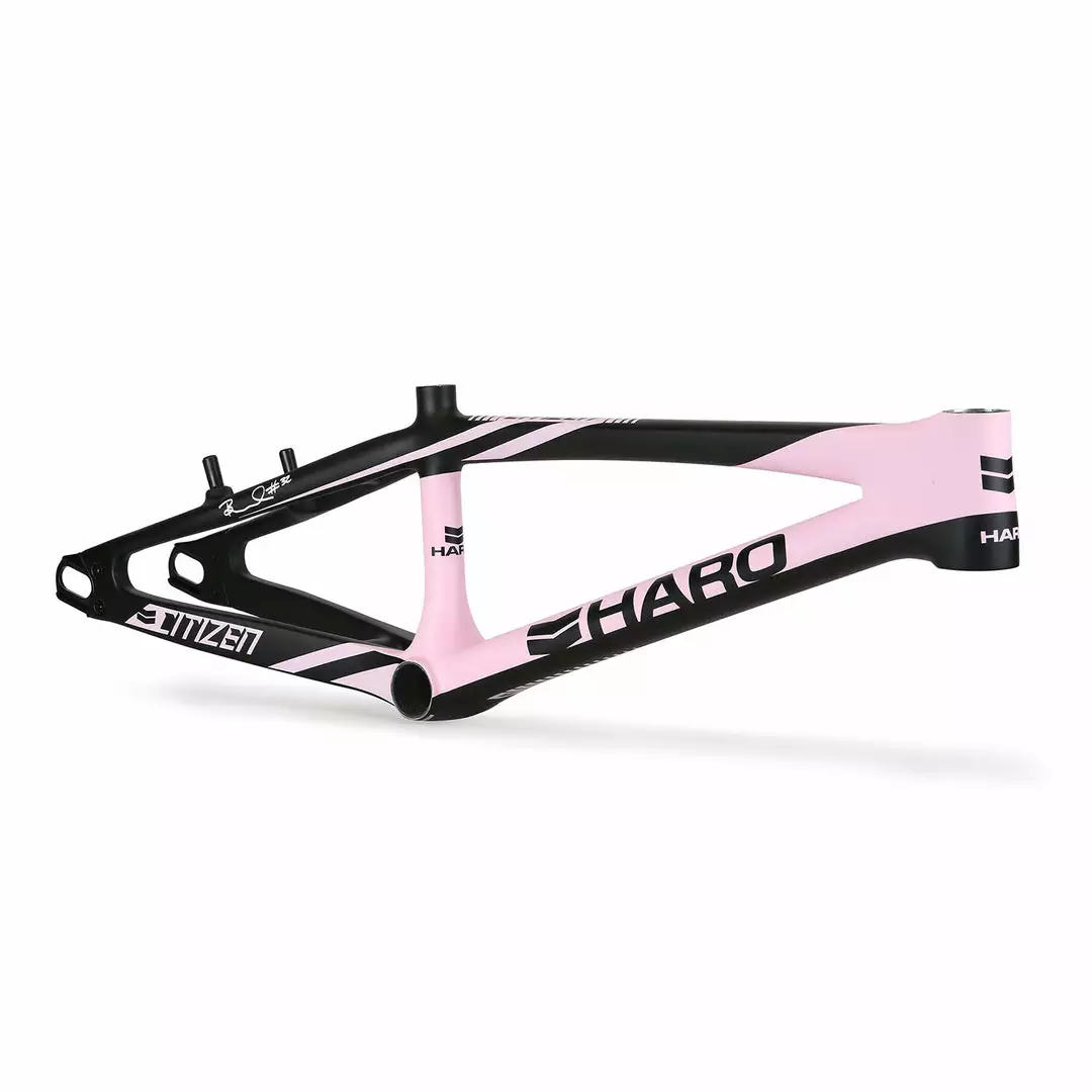 The Haro Citizen Carbon BMX Frame-Pink has the perfect color to standout on the track. Be rad and pretty in pink. Haro’s reputation is always backed by BMX’ers. The frame is made up of an 86.5mm wide shell allowing the down-tube and chain-stays to spread to the outer width of the shell and create undoubtedly the stiffest, most responsive bottom bracket concept to hit the BMX market. The head-tube of the Citizen is a tapered 1-1/8″ – 1.5″ design which stiffens up the front end of the bike for maximum steering response. The rear dropouts of the Citizen are a removable CNC machined alloy design compatible with 10mm, 15mm and 20mm rear axles with the included hardware and adapters.