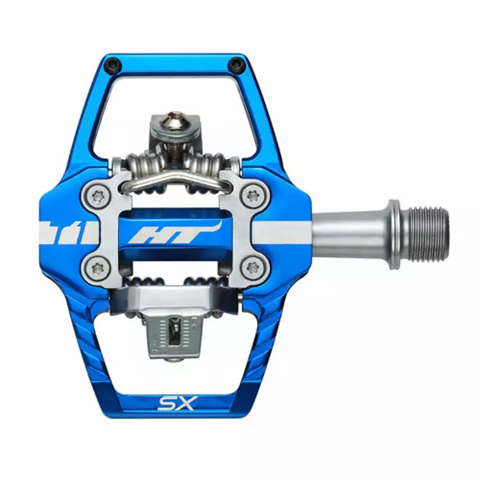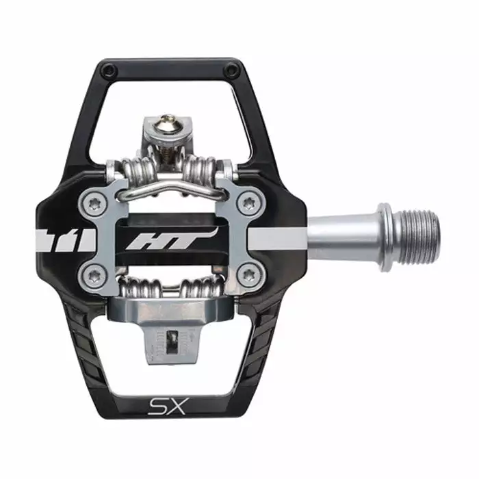 The HT Pedals T1-SX Clipless BMX Pedals are light and smooth with a small cage to protect the mechanism from whatever tumbles you might take at the track. The SX version improves upon the original T1 with stiffer springs and redesigned plates and bolts for added strength. Clipping in and staying clipped in has never been so easy.
