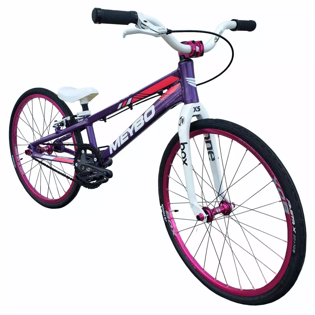 Our Pro Built Custom Mini BMX Race Bike-Purple-White-Pink will give you a step up in your race game. We all know a custom built bike is superior, but it also takes a lot of planning, measuring, and work. We’ve done all that for you and made it look good too! All you need do is get on and ride. Featuring so many high end components like Meybo’s Holeshot mini frame, Box rims, fork, stem, and cassette hubs. Rounding it all out is a multitude of components from Sinz and Tioga Fastr tires.