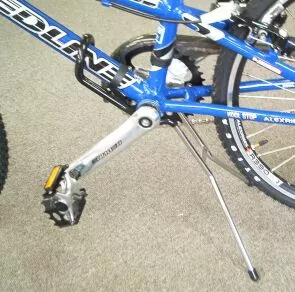 Easy to use chrome bike stand that rests on the down tube and bottom bracket to hold the rear wheel off the ground.