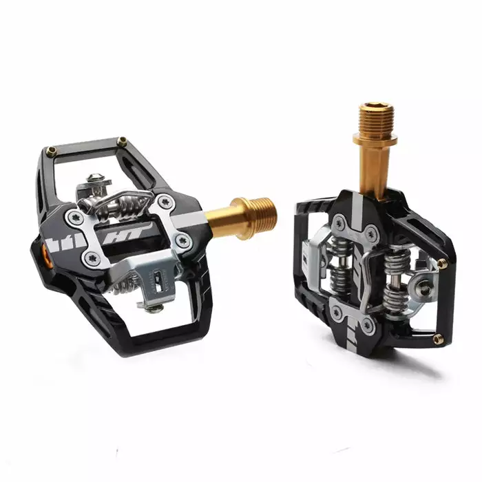 The HT T1 Titanium Axle Clipless BMX Pedals are light and smooth with a small cage to protect the mechanism from branches and rocks on the trail or from whatever tumbles you might take at the track.