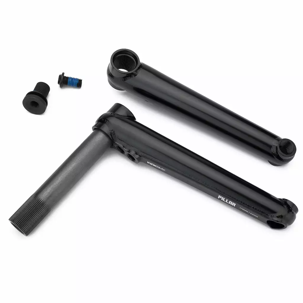 The Kink Pillar 2-Piece BMX Crankset at J&R Bicycles features innovative design that uses a one-piece forged backplate linking the pedal and spindle bosses. This also acts as a durable foundation for each crank arm and fortifies weak spots found in traditional tubular cranks. The hollow chromoly spindle is TruTherm heat treated post-weld for even more strength. Right-hand or left-hand drive compatible, also compatible with regular and Micro drive sprocket bolt bosses.