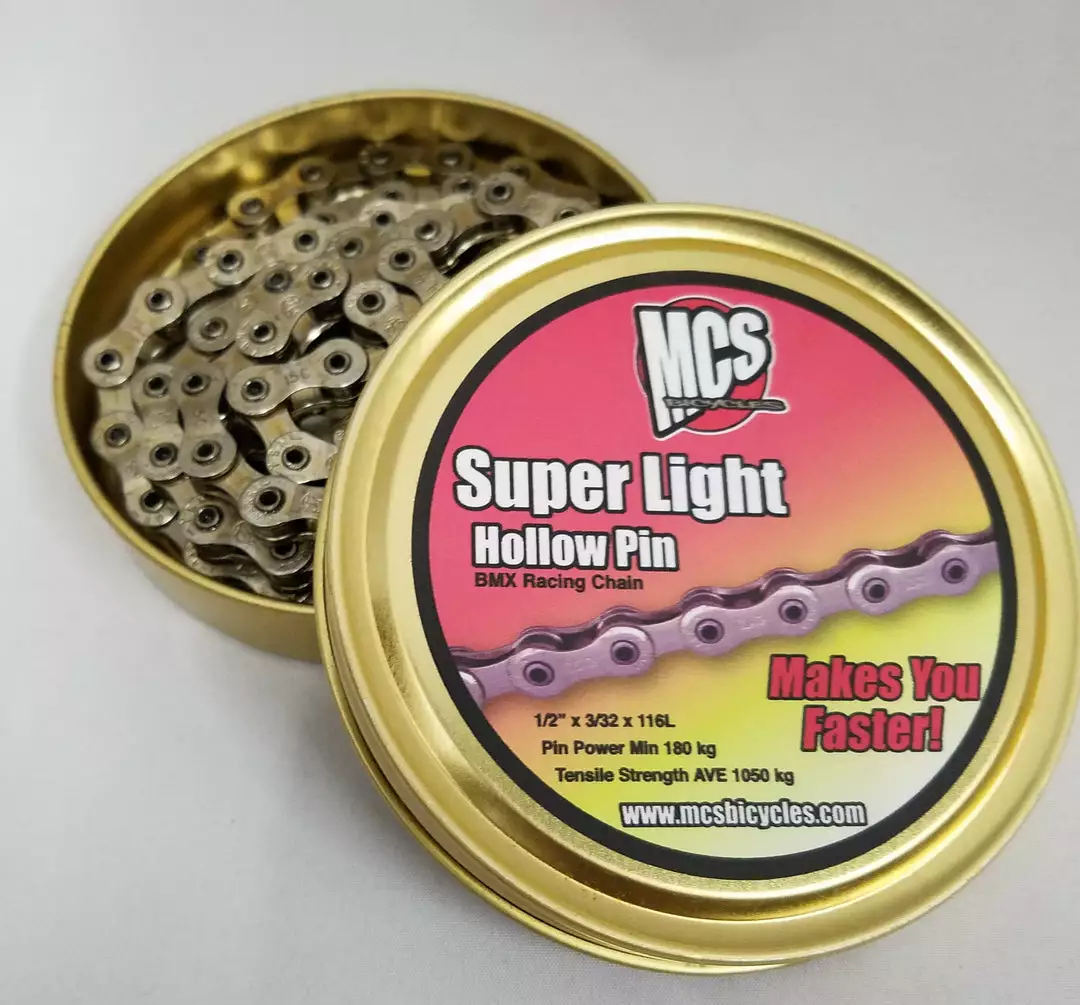 The MCS Super Light Hollow Pin Chain-3/32″ feature hollow pins for weight savings, nickle plating to make it last longer and 116 links to give you the flexibility you need to run it on any BMX gearing set up.