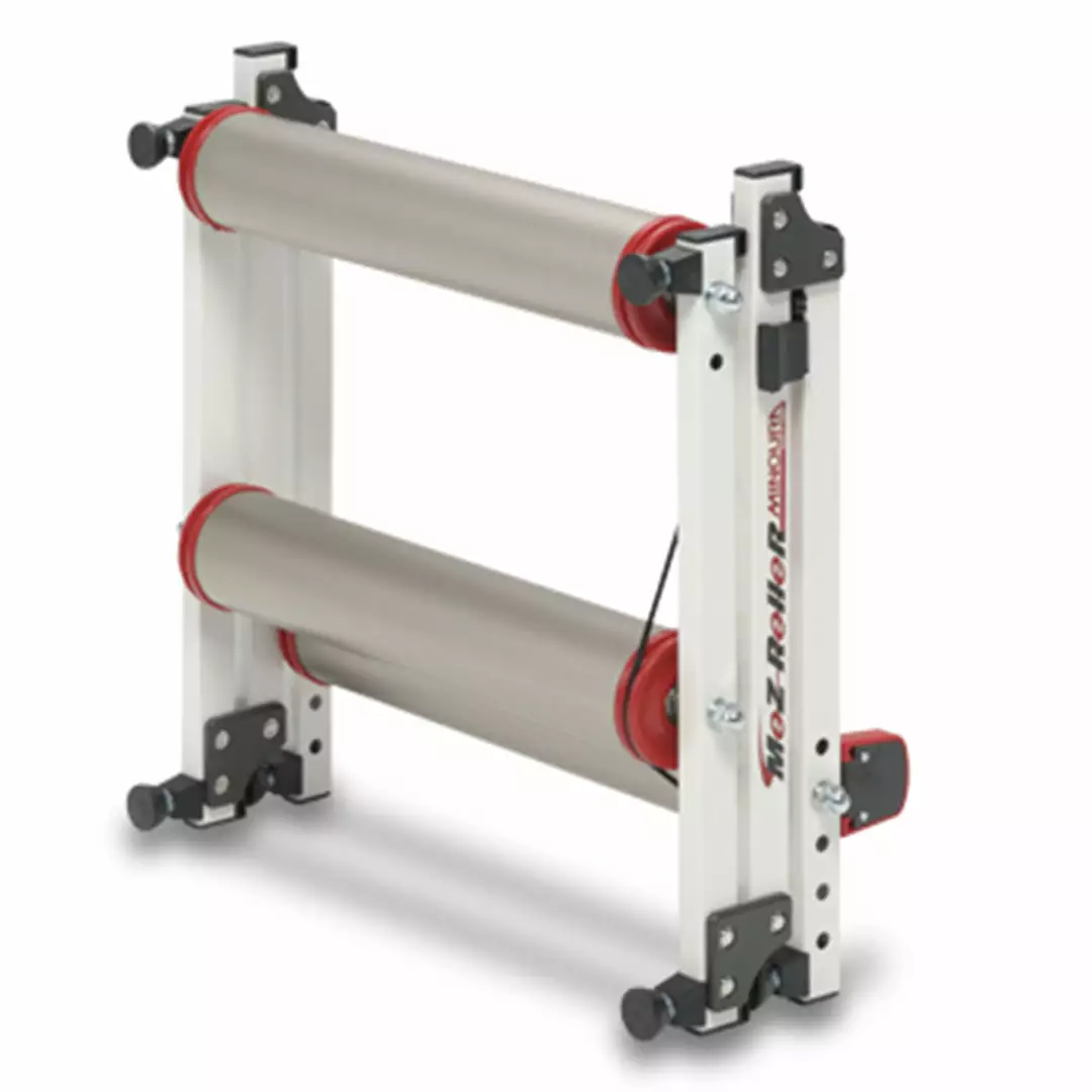 The Minoura MOZ Folding Rollers-With Step Guard at J&R Bicycles can help you take your training to the next level no matter what the weather is doing. This roller, built from lightweight alloy, easily folds up for compact storage and convenient transport. It features a raised mid-frame that can be used as a step and each roller has a noise insulator for super quiet training so you won’t disturb others and can ride in peace.