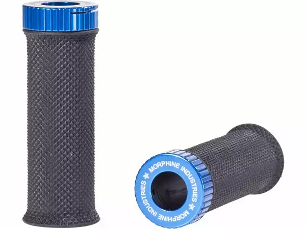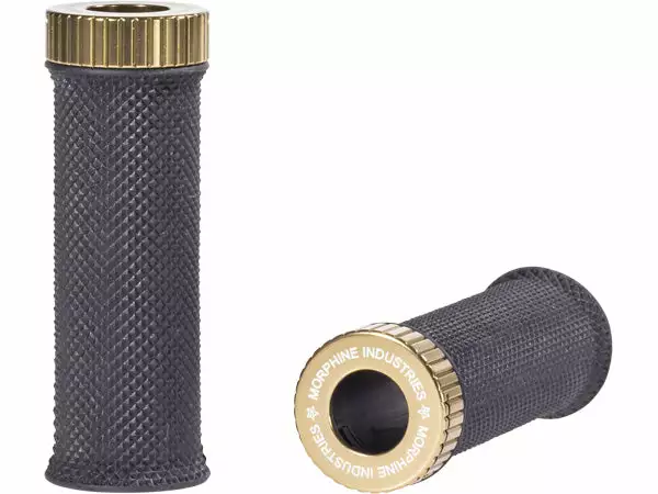 The Morphine Industries Grom Mini Lock-on BMX grips feature a thin knurled rubber gripping surface and a machined aluminum lock that also doubles as a bar end. The grip requires only one lock which reduces weight compared to other lock-on grips that use 2 locks.
