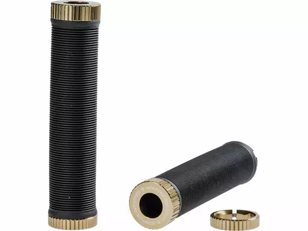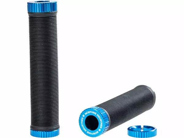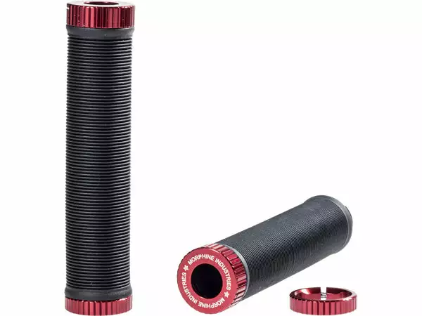 Morphine Industries Pleasure Lock-On grips feature low-profile “mushroom” pattern with machined aluminum locks and built in bar end.