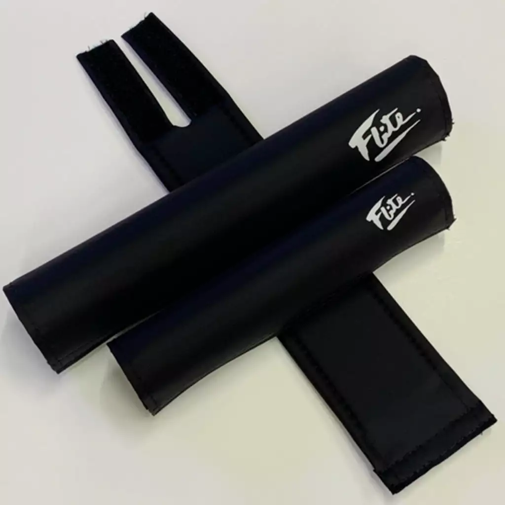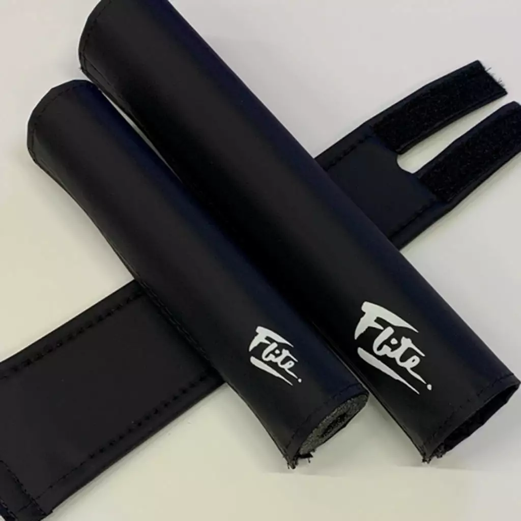 The Flite BMX 3-Piece Padset-80s-Red at J&R Bicycles features the classic throwback padset design you rode with as a kid made with modern materials. The pad covers are made from sleek nylon that can withstand all sorts of weather and riding conditions and have convenient Velcro closures and printed Flite logo. Each set comes with a handlebar pad, frame pad and stem pad.