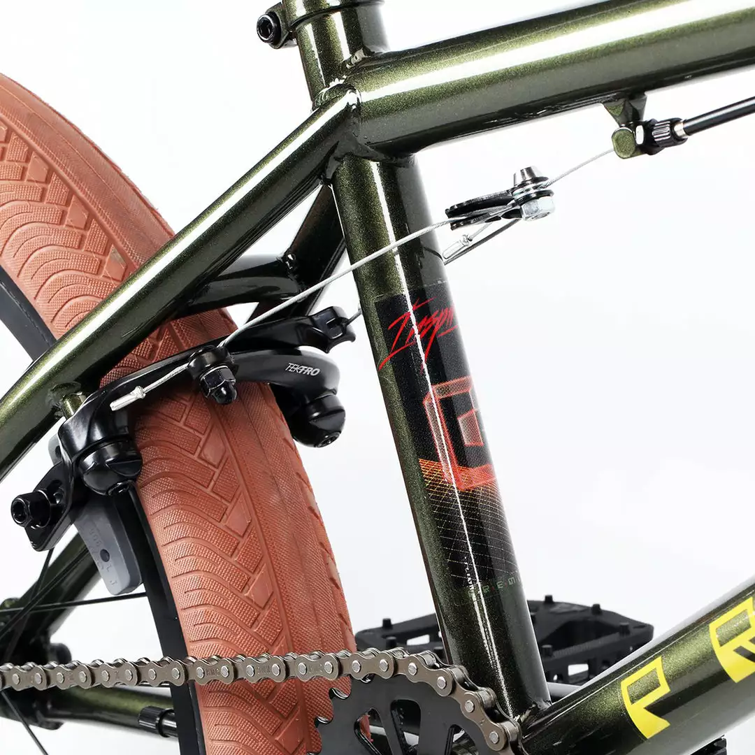 - Full hi-ten frame with integrated head tube and integrated seat clamp, Mid BB shell and 20.5″ top tube