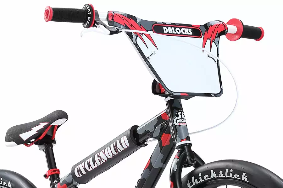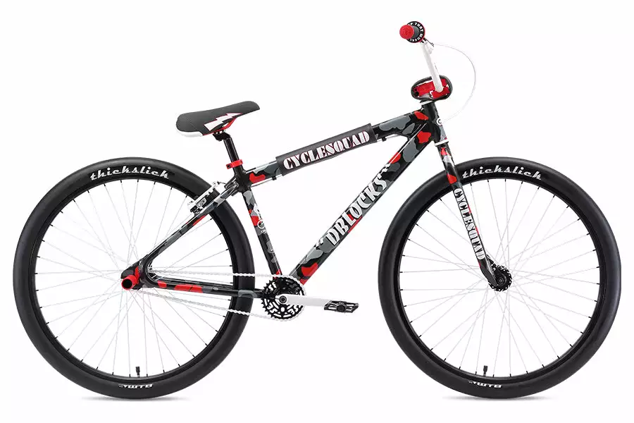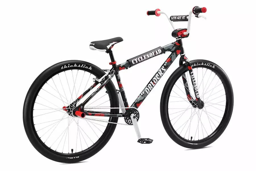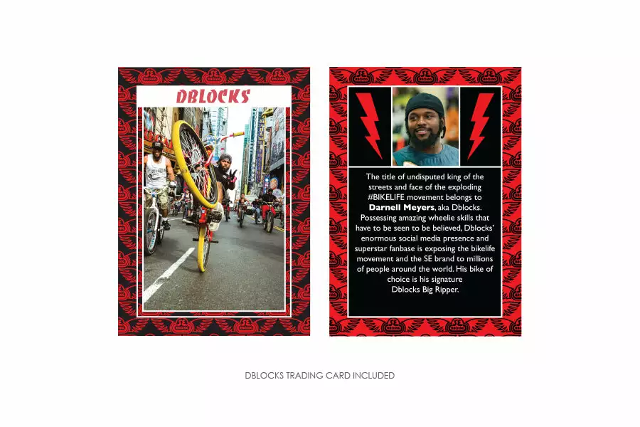 The undisputed king of the streets gets his own signature bike this year. That’s right Darnell Meyers, aka Dblocks is crowned with his very own SE Racing Dblocks Big Ripper. Dblocks put his personal touch on this bike with unique spec choices such as the Harlem camo paint, Freedom ThickSlick tires, Power Wing cruiser bars, Raise it Up Flyer seat, Keep That Wheel Up grip donuts, Dblocks camo plate, and Cycle Squad Maniaccs padset. The time is now, lets get it!