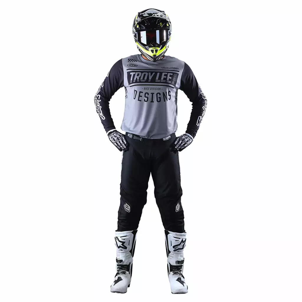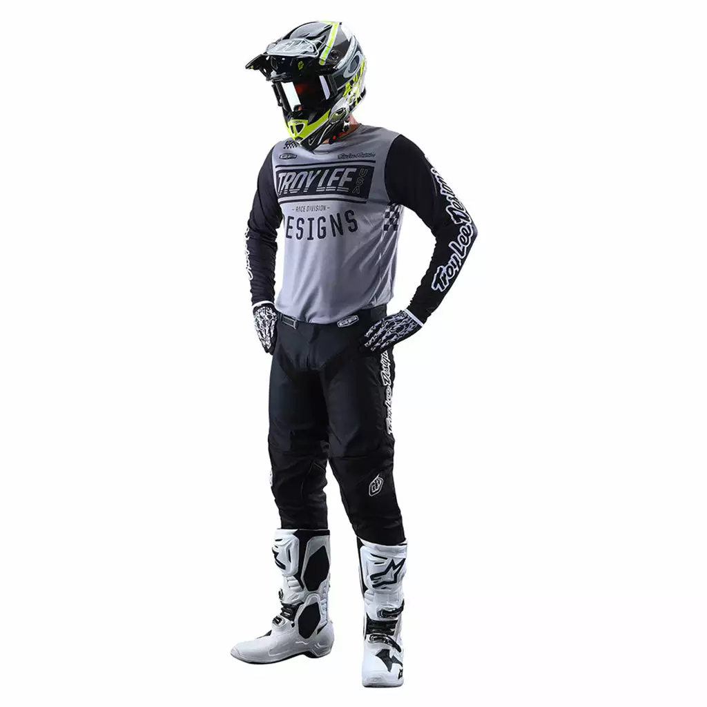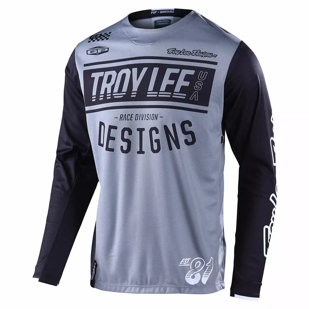 The Troy Lee GP Race 81 Jersey-Gray at J&R Bicycles is designed with eye-catching style and constructed for comfort and perfect fit regardless of conditions. Made with lightweight and breathable DuraKnit material, this jersey moves with you when you need it without clinging to you. Featuring wicking and quick dry finishes for maximum comfort while the silicone Troy Lee Designs signature on the tail prevents the jersey from riding up while you ride.