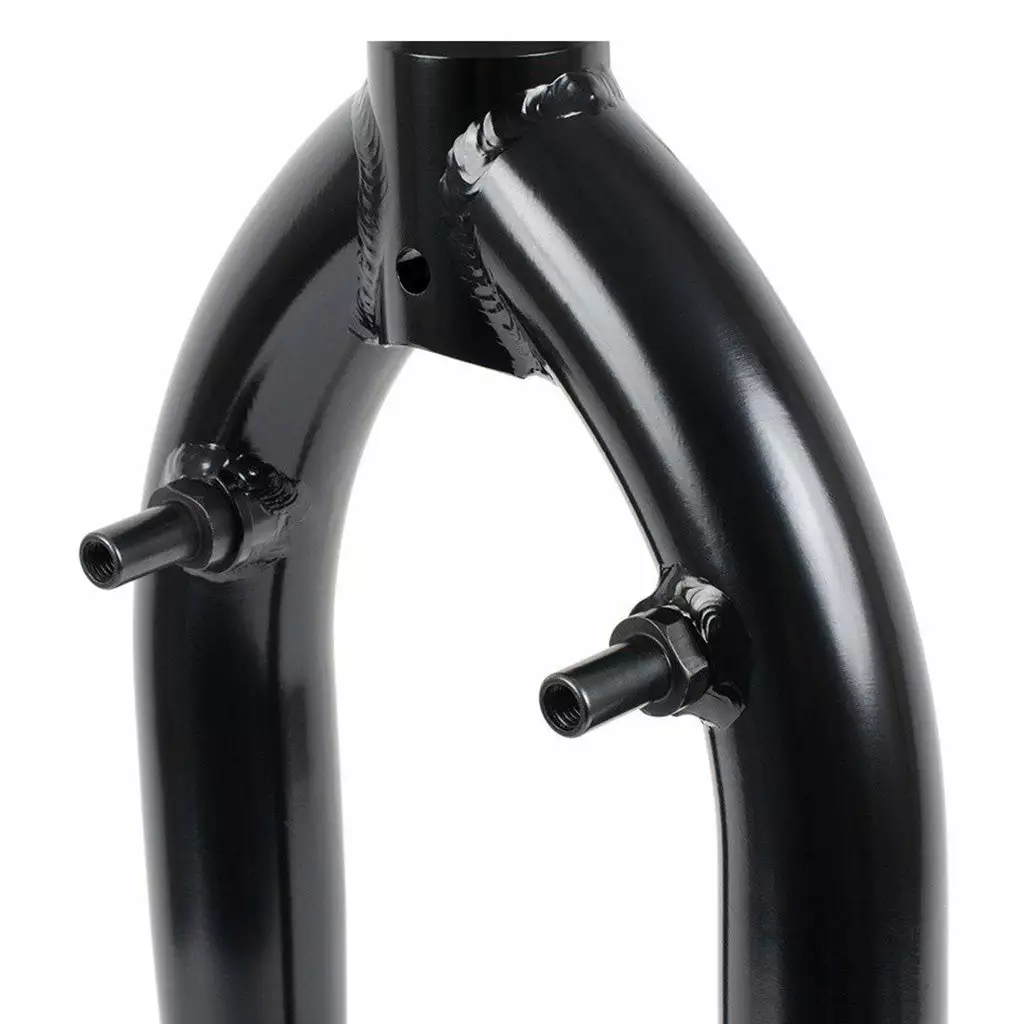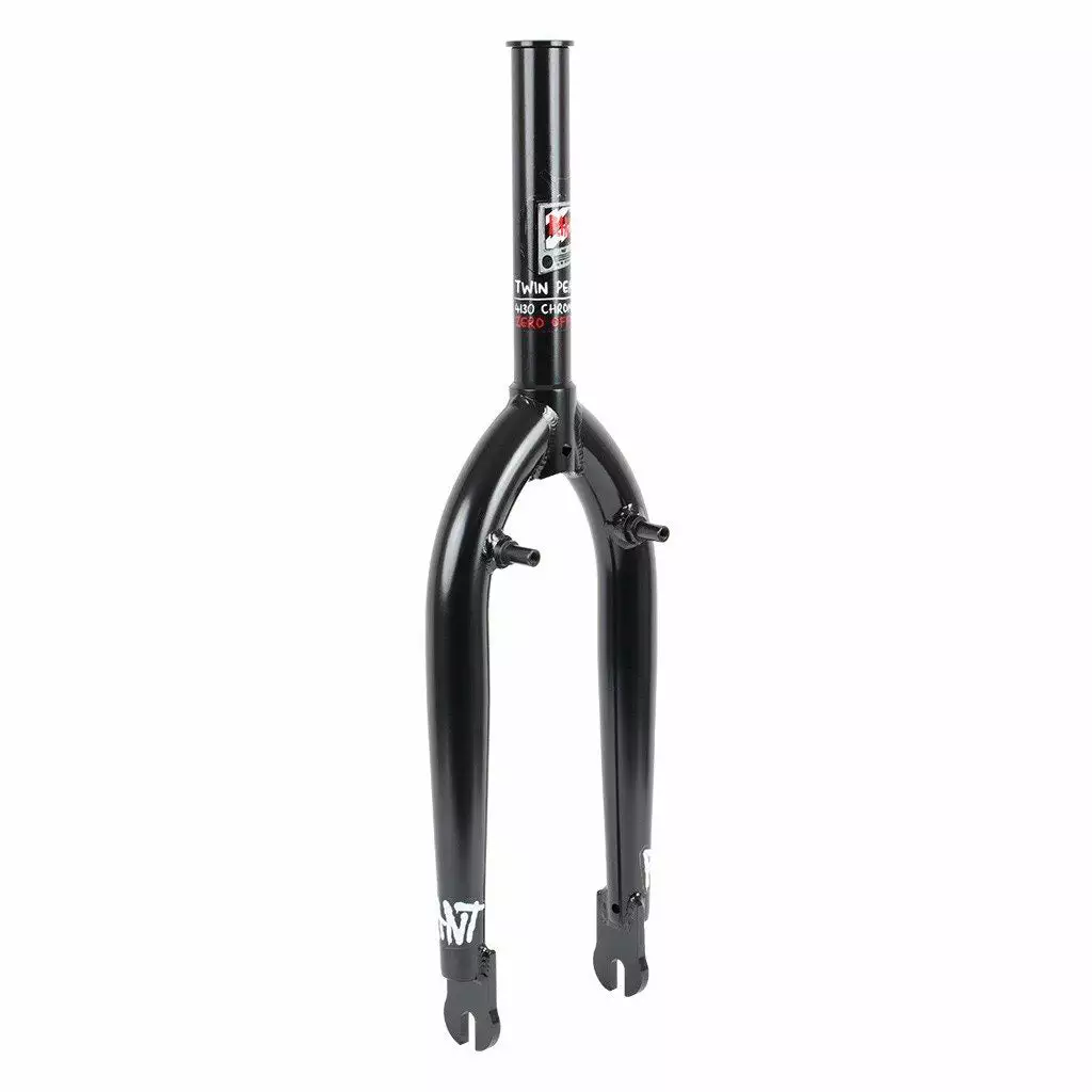 The Rant Twin Peaks Zero Chromoly Fork at J&R Bicycles is a quality yet affordable fork designed to handle high-tech street maneuvers and flatland tricks. This fork features a zero offset for superior responsiveness and handling and is made from super strong 4130 chromoly tubing. Features also include tapered legs with laser-cut 6mm dropouts, integrated bearing race and a threaded compression cap made of 6061 aluminum alloy. Tons of value for a reasonable price.