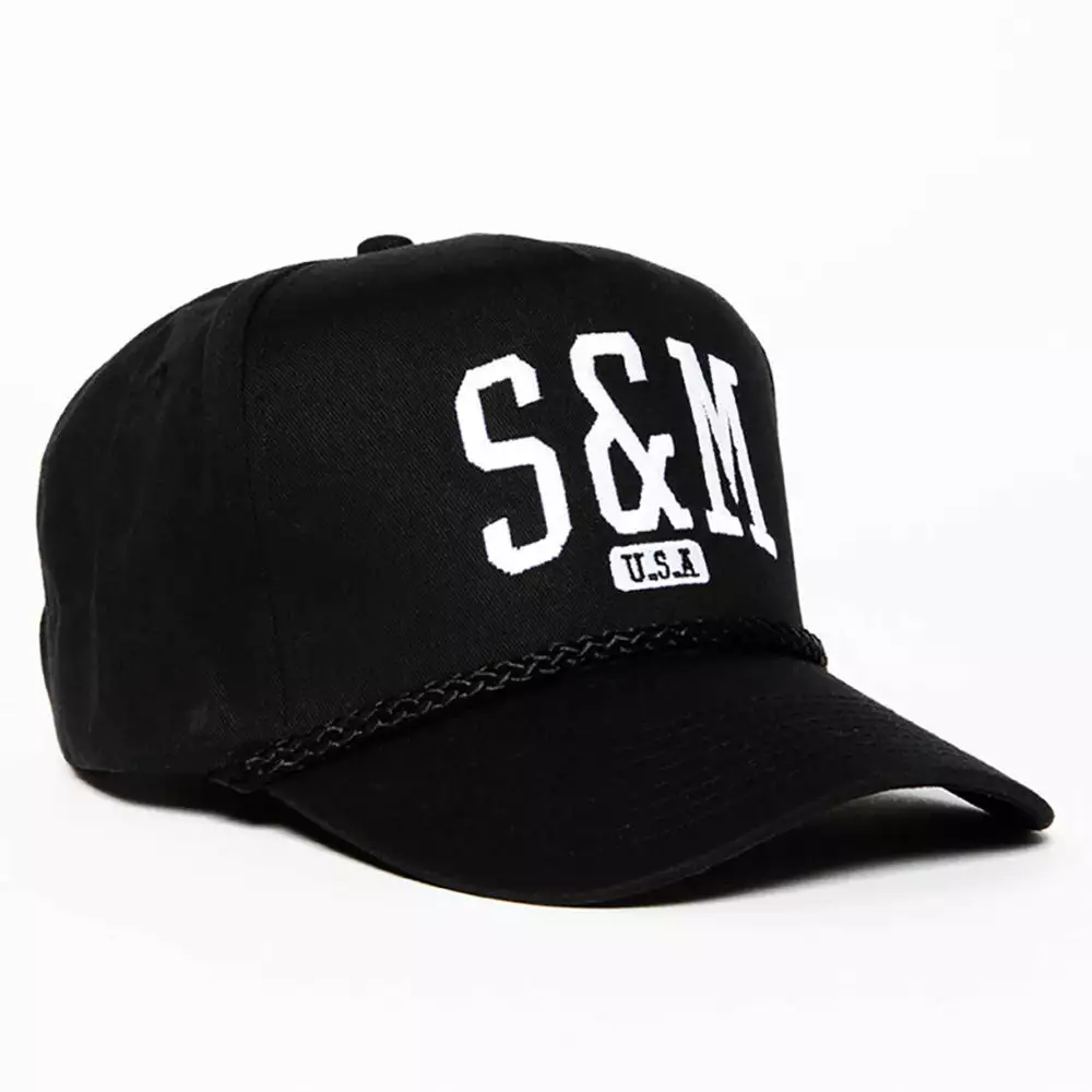 The S&M SMU Snapback Hat-Black is a cotton twill 5-panel hat with a fancy woven line where the brim meets the crown. Embroidered S&M logo on the front.