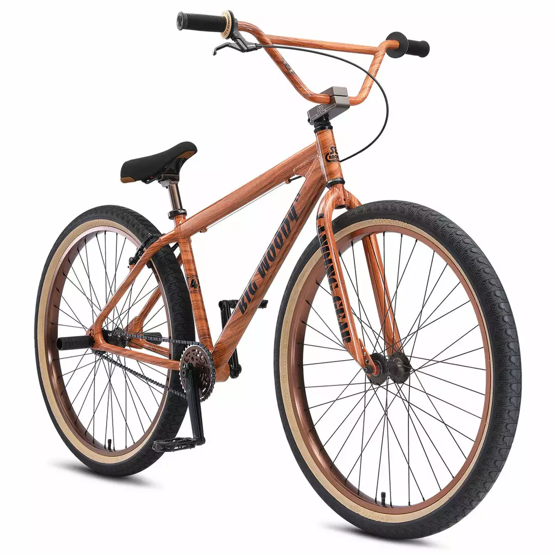 The big bike BMX boom is now and the SE Big Ripper 29″ BMX Freestyle Bike-Wood Grain is right in the middle of the storm. Features a 6061 aluminum alloy frame matched to chromo Big Honkin’ bars and a Landing Gear fork. Fitted with 29″x2.4″ SE Bozack tires for the perfect blend of speed and comfort. Rounding out the package are a set of ODI Mushroom II grips with color matched, commemorative donuts. Get out there, raise it up, and show the world your “Big Woody”.