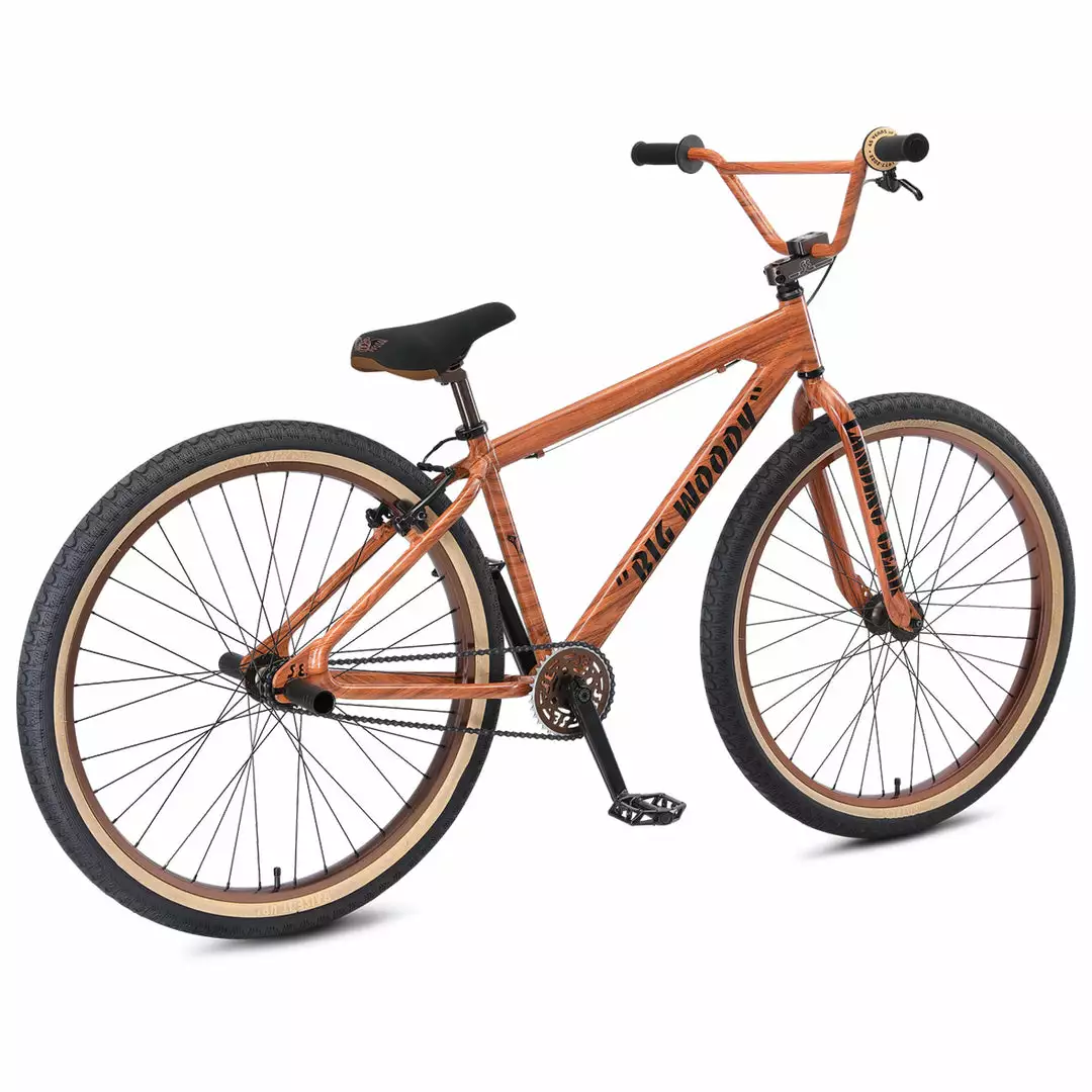 - ACCESSORIES: Checkerboard SE Snap Padset, (Wood Grain Bike Without Padset), Alloy Valve Caps, SE Wheelie Pegs