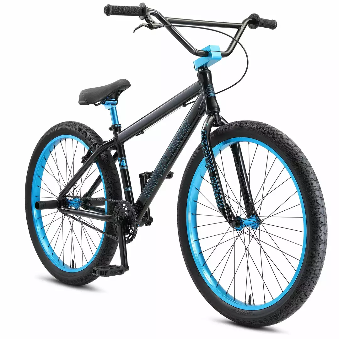 Whether you are looking to cruise the streets or pop some wheelies the SE Blocks Flyer 26″ BMX Freestyle Bike-Stealth Mode Black-Blue Ano is the bike for you. The frame is crafted from lightweight 6061 aluminum Floval tubing to keep it super tough and lightweight and the all new Bozack 26″ x 2.4″ tires will give you all the traction and control you need while ripping around and hugging corners. This bike is loaded with features to make the most of your ride. The double-wall rims come and sealed bearing rear hub keep things rolling smoothly for longer and the retro top-load stem features a hidden top cap to keep things looking slick. The SE Blocks Flyer comes equipped with alloy valve caps and SE Wheelie pegs so you can get out there and start cruising.