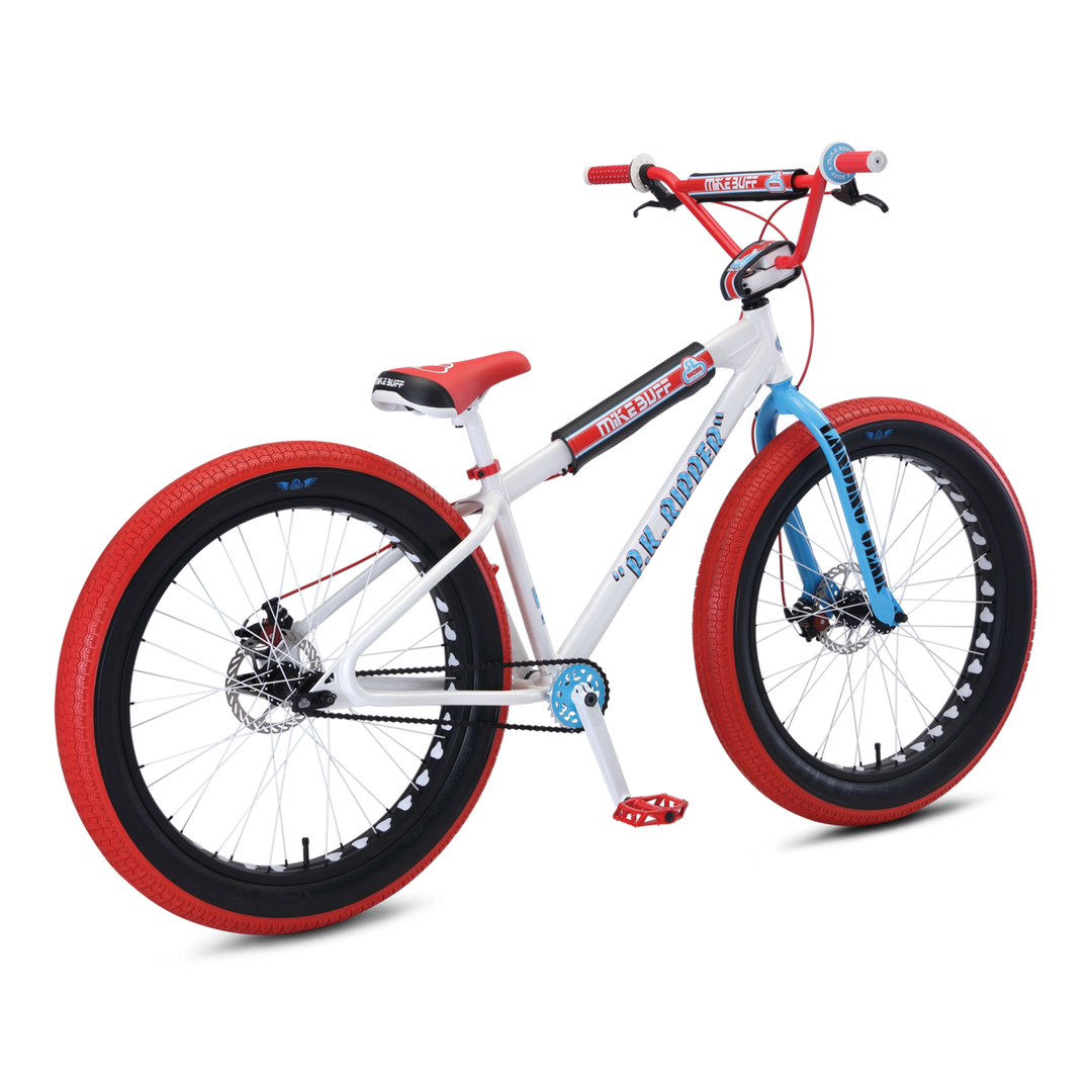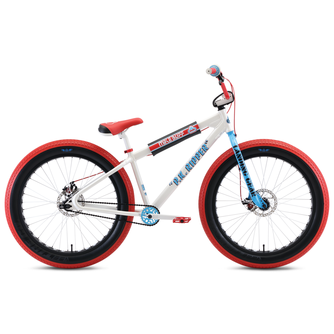 The SE Racing 2020 Mike Buff Fat Ripper-26”-Arctic White resonates with the same style as the legendary PK Ripper that Mike made famous. As one of the original godfathers of freestyle, Mike rode a PK Ripper in the early 1980s and helped introduce freestyle BMX to the world. This bike can monster truck over anything with its fat 26” x 3.5” Vee Chicane tires. It comes equipped with a Mike Buff BMX Action padset, Oakley B-1B grips, and an authentic SE Racing/Mike Buff trading card personally signed by Buff.