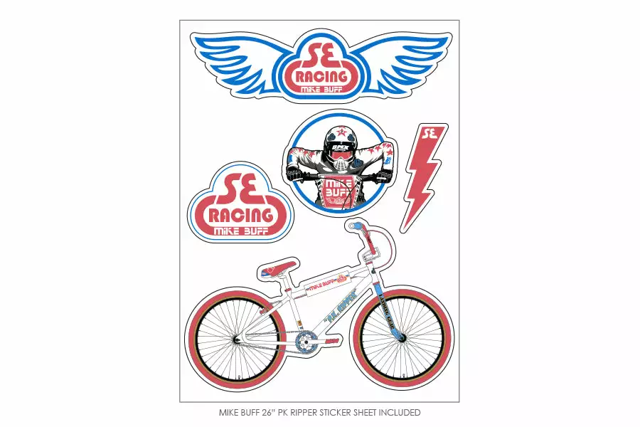 - Accessories: SE Racing Rad Number Plate, Mike Buff BMX Action Padset, Alloy Valve Caps, Custom Mike Buff Big Ripper Sticker Sheet, Authentic Trading Card Personally Signed by Mike Buff, SE Wheelie Pegs