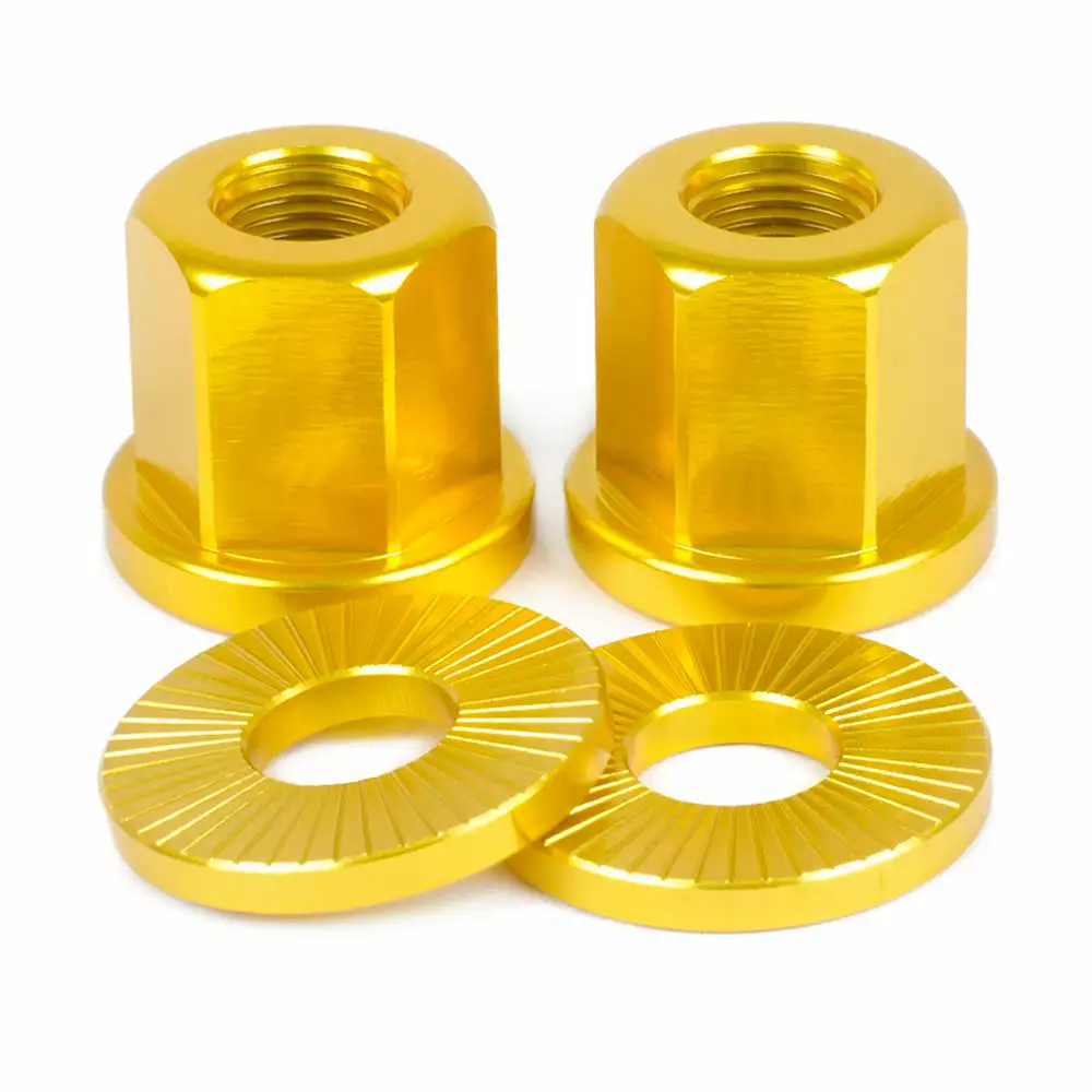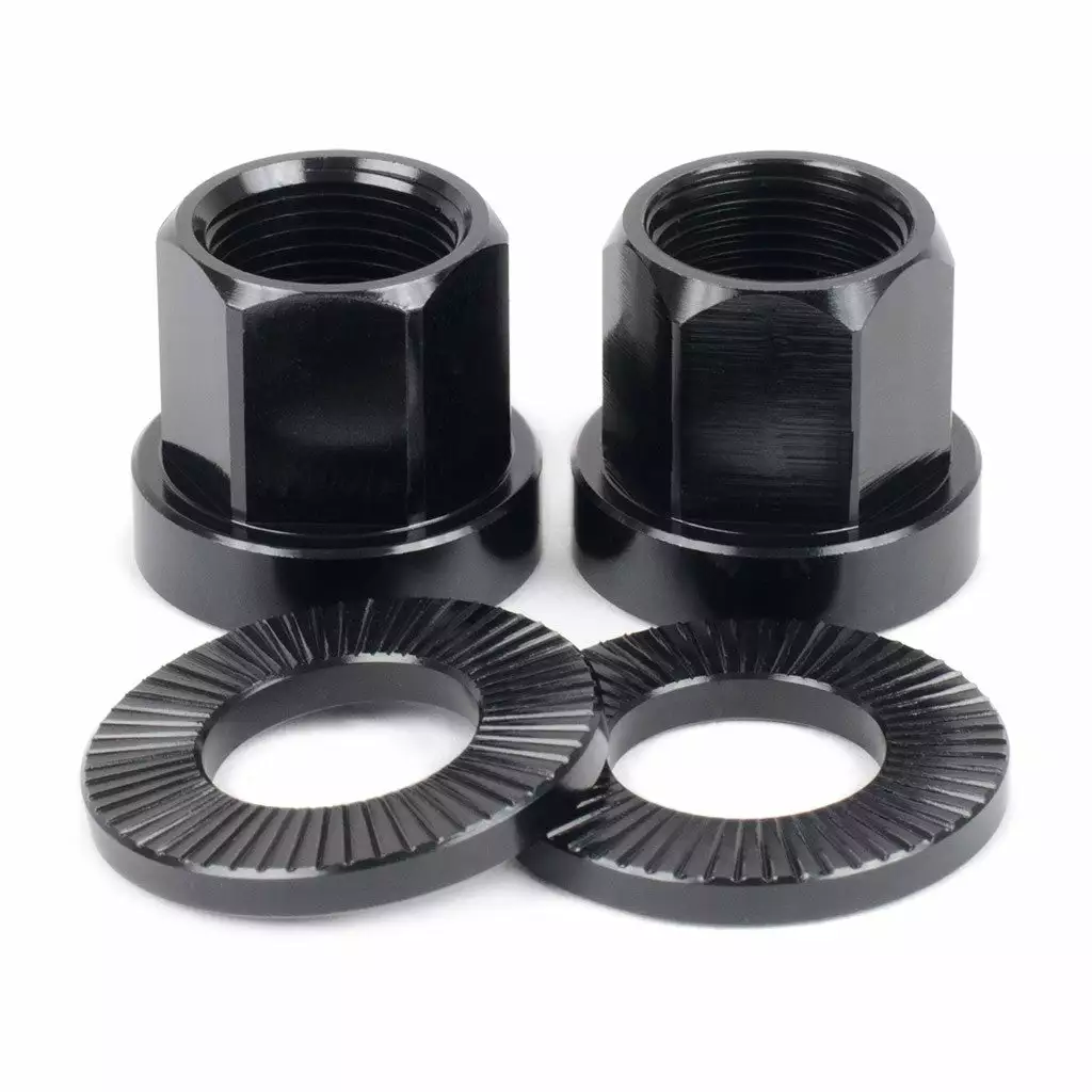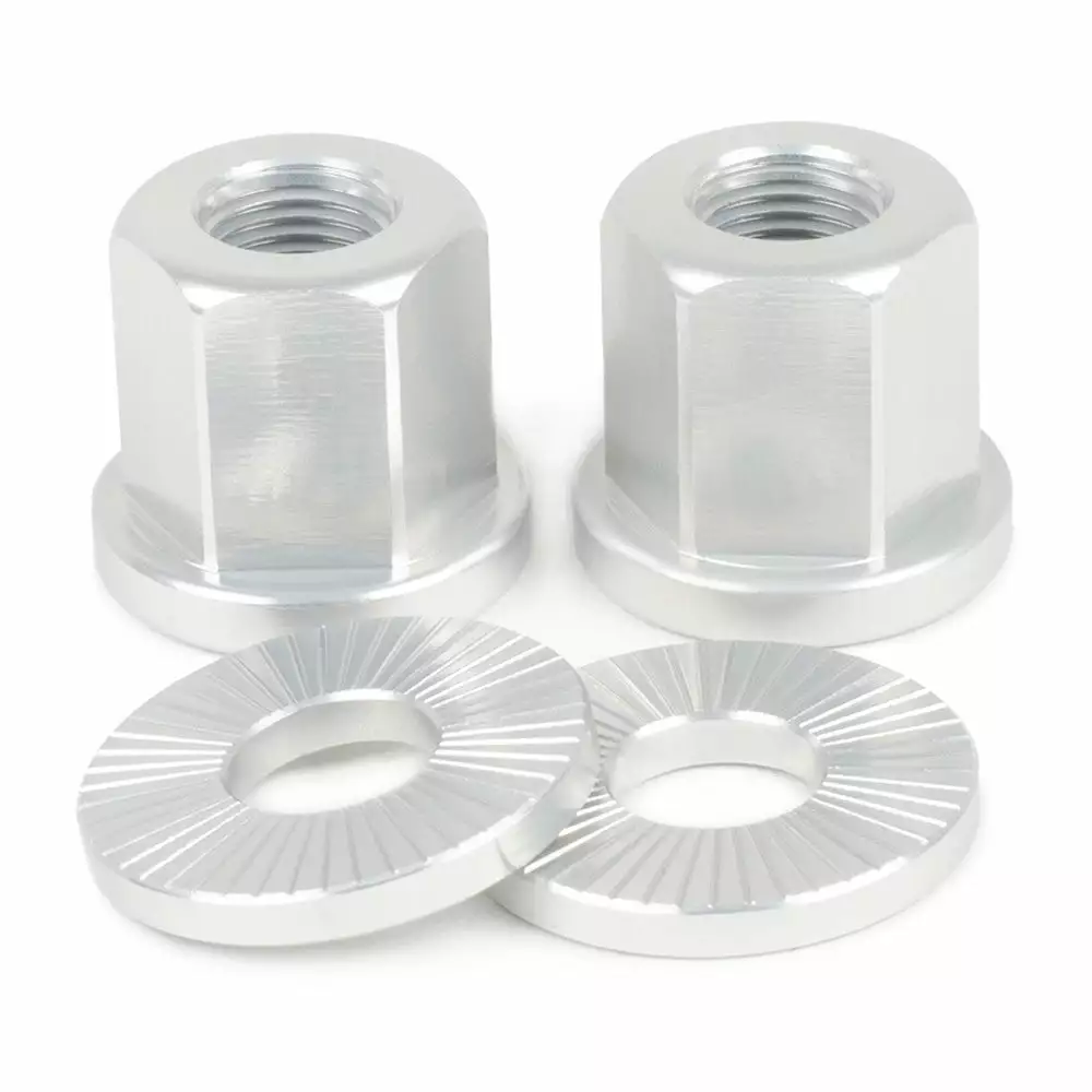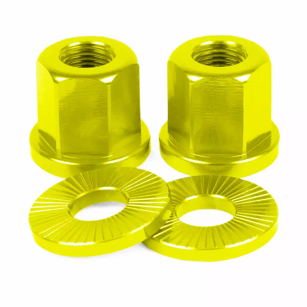 At half the weight of steel nuts, the Featherweight Alloy Nuts are an easy way to spec your ride and add a little flare. Made from 7075 -T6 aluminum, they are CNC’d to exacting specifications with 17mm wrench flats for both the 14mm and 3/8” sizes. Includes matching anodized washers.