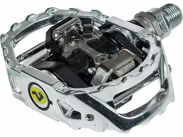 Aluminum caged Clipless pedal with sealed cartridge chromoly spindle. Adjustable cleat tension and includes cleats. This is a great pedal for stability in a race.