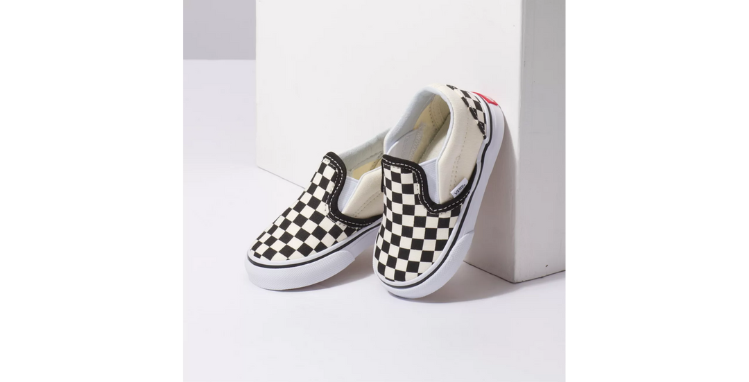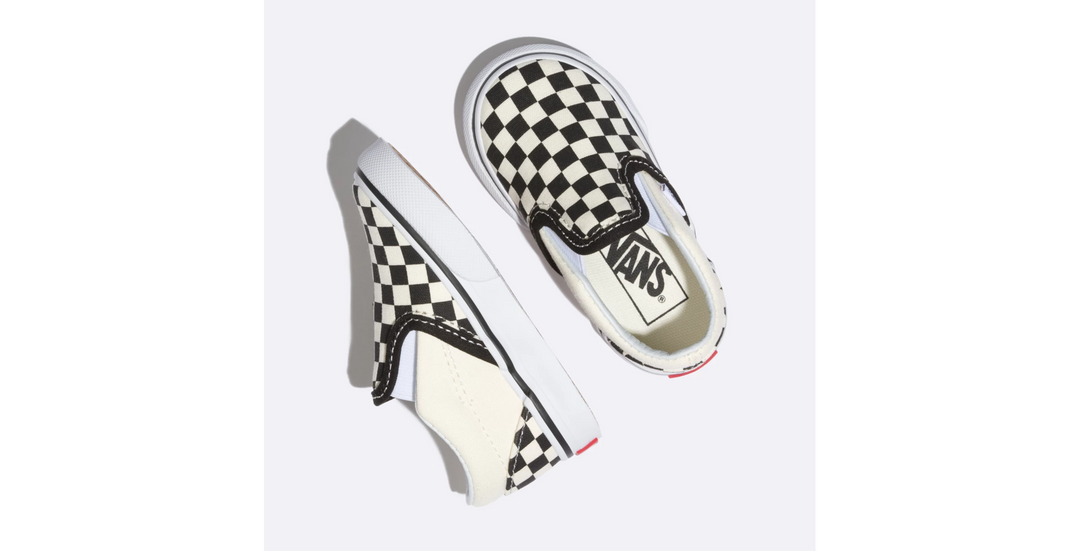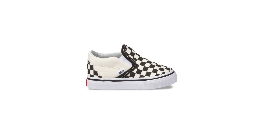 The Vans Classic Slip-On Todder Shoe-Black/White Checkerboard has a low profile, slip-on canvas upper with all-over checker print, elastic side accents, Vans flag label and Vans original Waffle Outsole.