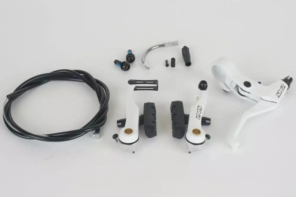 The Sinz V-Brake Kit is available in Pro and Mini sizes. The Mini kit is used for younger riders with 1/8 or 3/8 wheels. The Pro kit is used for all bikes with 1.5 or 1.75 wheels. Each kit comes with brake, lever, cable, and all the necessary hardware including noodle, dust cover, and cable-end cap. The brake and lever are constructed from 6061 aluminum.